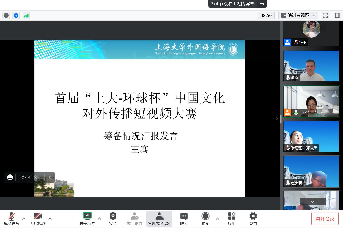 上海市教委项目“中国故事”视频赛负责人万华教授对大赛主题、宣传动员、时间安排等方面提出了建议。她认为,大赛主题要突出,准备要充分,动员要广泛,时间要合理,方案要细化,需要进一步提升宣传热度。