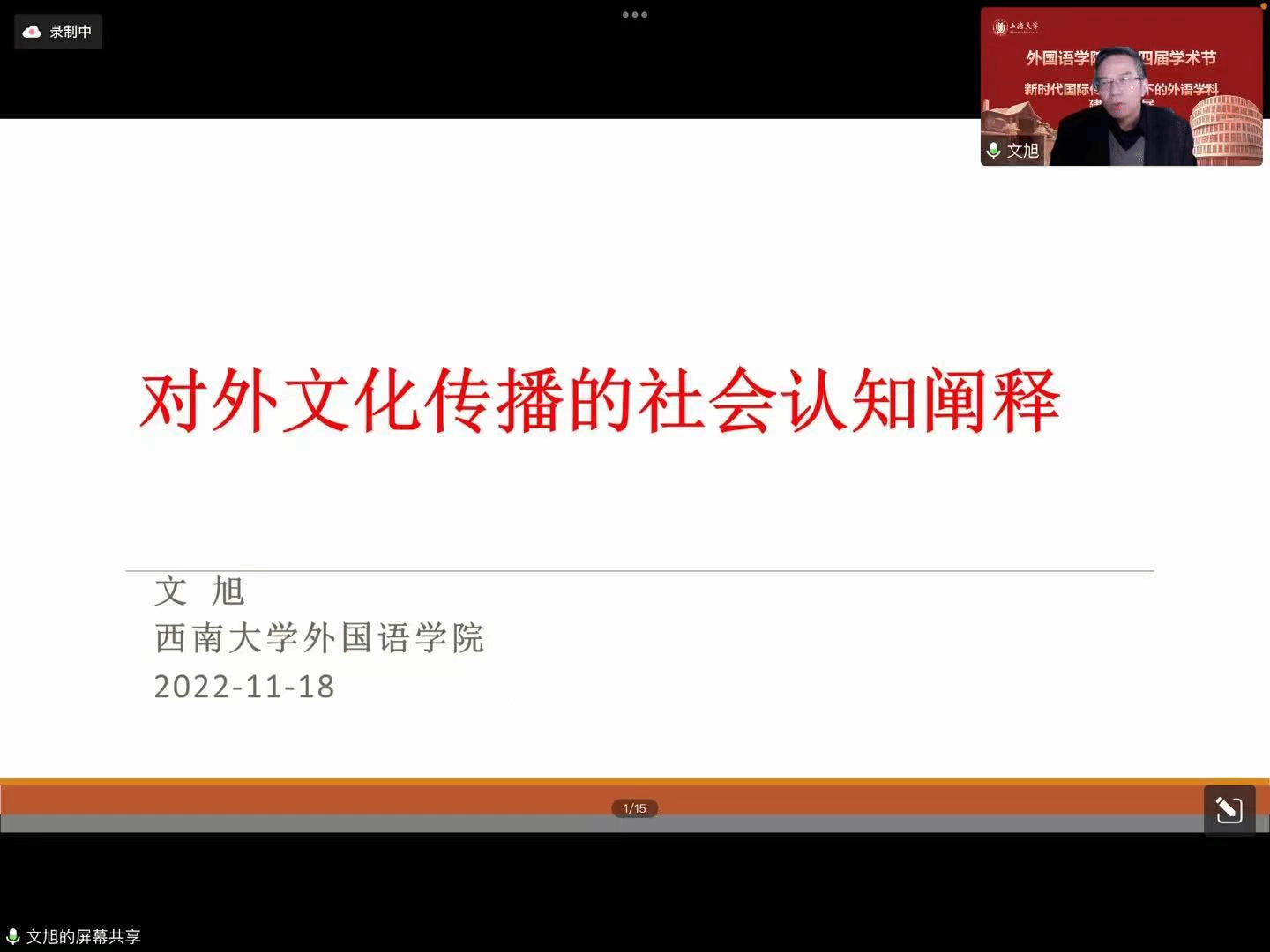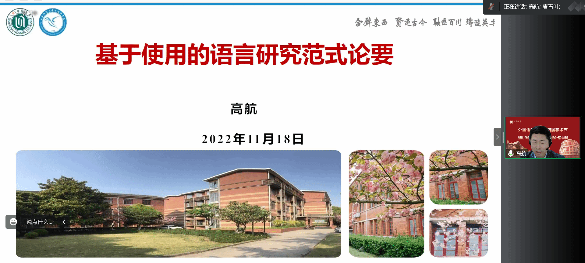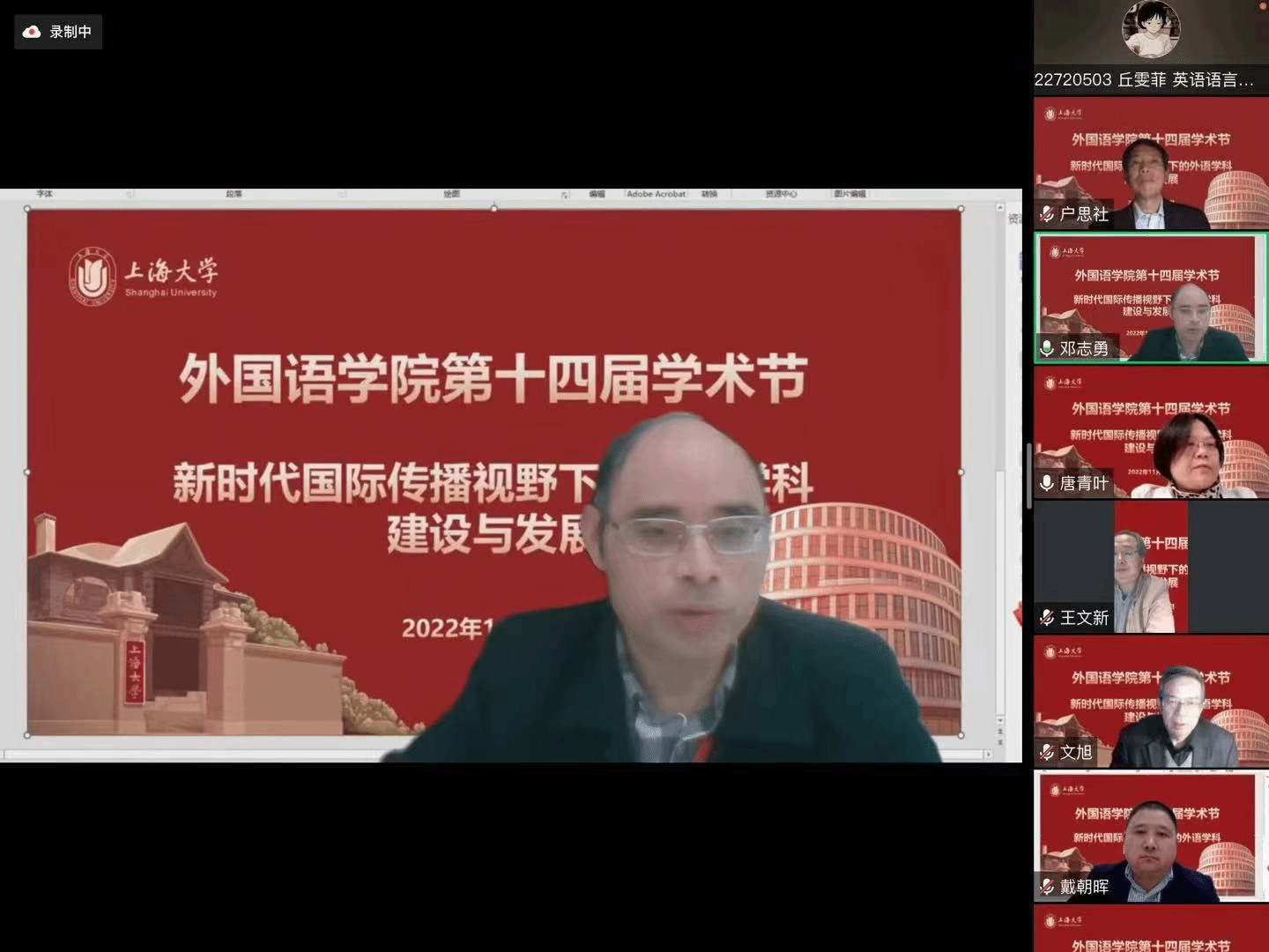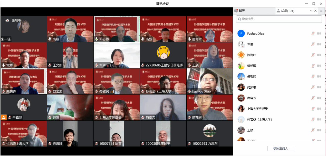 在喜庆党的二十大胜利召开、澳门正规电子游戏平台建校100周年,以及对接“中华文化走出去”“讲好中国故事”的国家战略需求背景下,澳门正规电子游戏平台积极作为,竭力为国家战略发展、上海市城市软实力提升和以上海为核心的长三角协同融合做贡献,举办以“新时代国际传播视野下的外语学科建设与发展”为主题的系列学术活动暨澳门正规电子游戏平台第十四届学术节。11月18日下午以线上形式举行学术节开幕式,主题为“新时代国际传播视野下的中西语言文化比较研究”。本次开幕式有六位专家做主旨报告,澳门正规电子游戏平台副院长唐青叶和戴朝晖担任主持,约200名校内外师生参加。