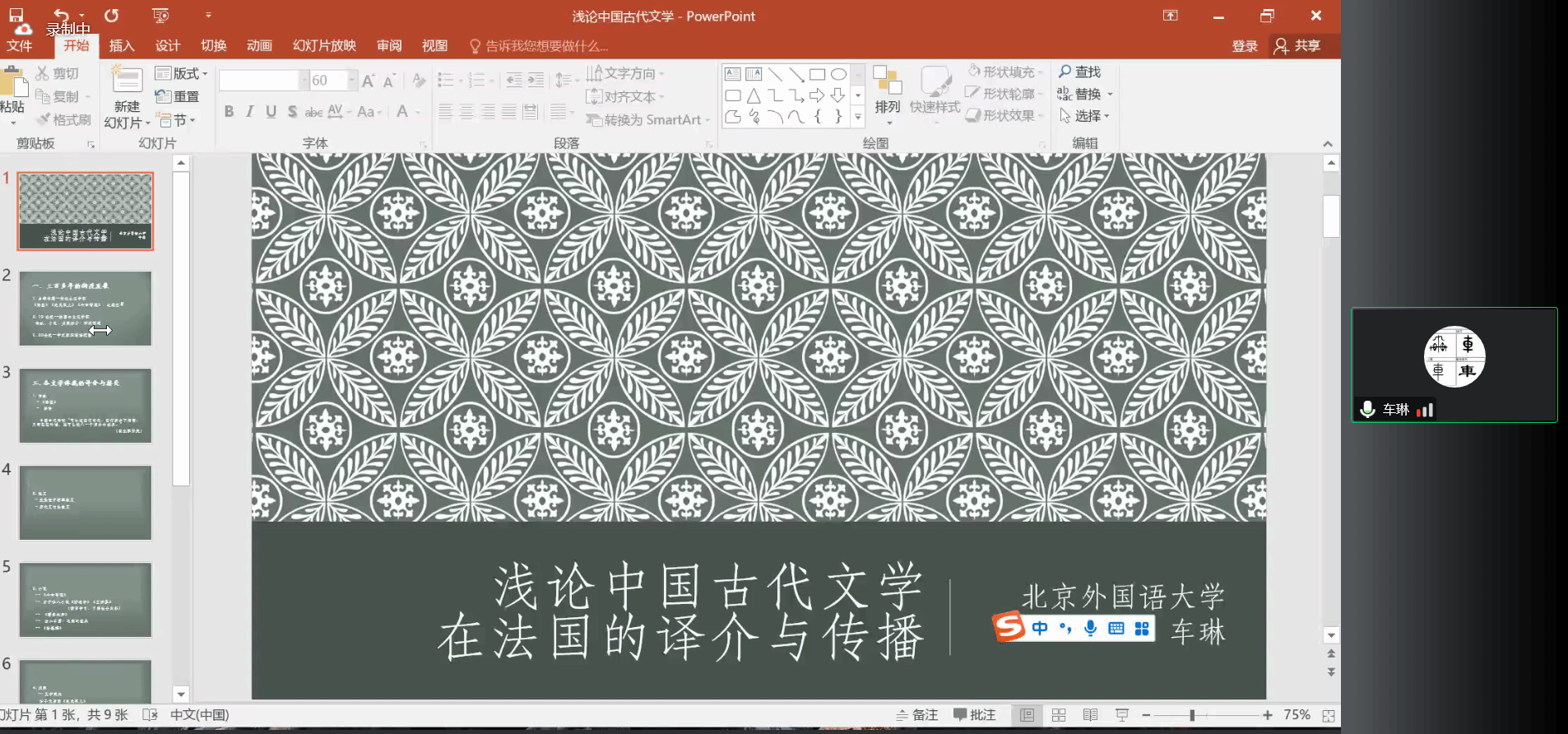 第一位主讲人是北京外国语大学的车琳教授。她发言的题目是“浅论中国古代文学在法国的译介与传播”,她以中国古代文学在法国的译介和传播为例,考察其成就与局限,让我们更好地在世界范围内审视中国古代文化遗产的价值和影响,有助于突破东方与西方、传统与现代的绝对二元论,从而为增进不同文化之间的了解和沟通提供借鉴。