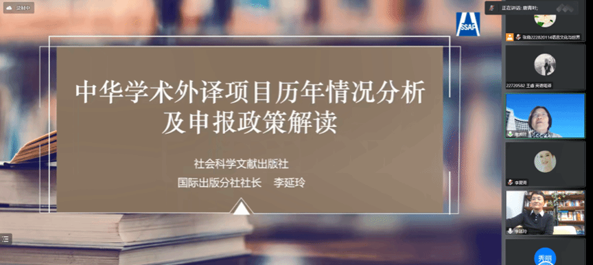 近日,全国哲学社会科学工作办公室发布了《2022年度国家社科基金中华学术外译项目申报公告》。为提高老师们申报积极性,帮助师生深入理解项目申报过程及重点注意事项,11月23日晚,澳门正规电子游戏平台和澳门正规电子游戏平台话语研究中心邀请社会科学文献出版社国际出版分社社长李延玲编审做了一场题为“中华学术外译项目历年情况分析及申报政策解读”的线上讲座。该讲座由副院长唐青叶教授主持,吸引了校内外近140名师生在线聆听。