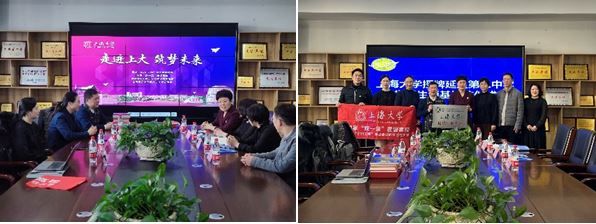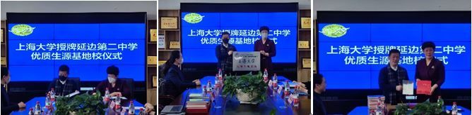 尚新院长与延边第二中学副校长王延芳代表双方学校共同签署《澳门正规电子游戏平台“优秀生源基地”合作协议》,并为优质生源基地揭牌;尚院长向延边二中赠送《百年上大》画卷和澳门正规电子游戏平台赵彦春教授的“国学经典英译系列”书目。