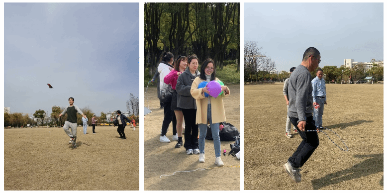 初春时节,阳光明媚,靠近美院一侧的大草坪上欢声笑语,气氛热烈。老师们参与了抱气球、绑腿跑、飞镖、踢毽子、跳绳等项目,度过了愉快的两小时。