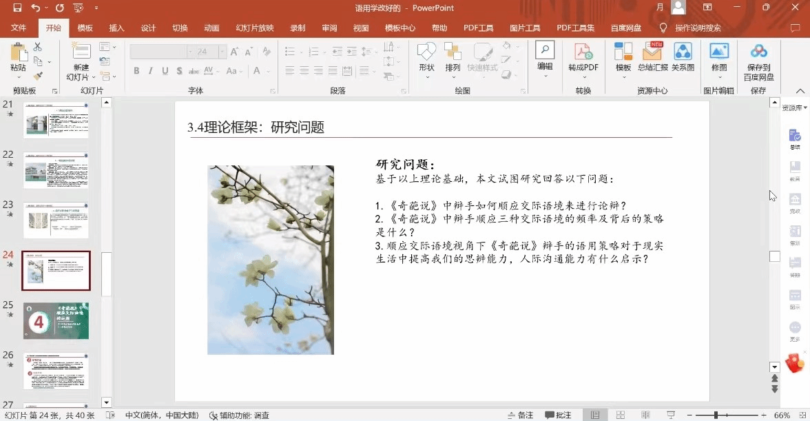 第二位主讲人为2022级研究生李诗宁。李同学的题目是《从视觉语法视角看中国扶贫国家形象的“自塑”与“他塑”》。她以Kress和Van Leeuwen的视觉语法为理论框架,从多模态话语的再现意义、互动意义、构图意义出发,对比分析了以扶贫为主题的我国官方媒体和外媒纪录片所建构的中国国家形象,为今后我国官媒在国际传播中进行纪录片创作和传播层面探寻相应路径,为深入解读“讲好中国故事”提供了参照。唐青叶教授提出国际传播应注意受众问题,就扶贫国家形象问题,李同学应深入挖掘外媒报道话语背后的动机以及深层意义,并可以在综述加入现有对中国扶贫形象的研究。张新玲教授肯定了李同学的报告思路,报告中有对国家国情的了解,语言学的理论的积淀和学以致用的态度,展现了语言学学科研究国际文化传播的意义。