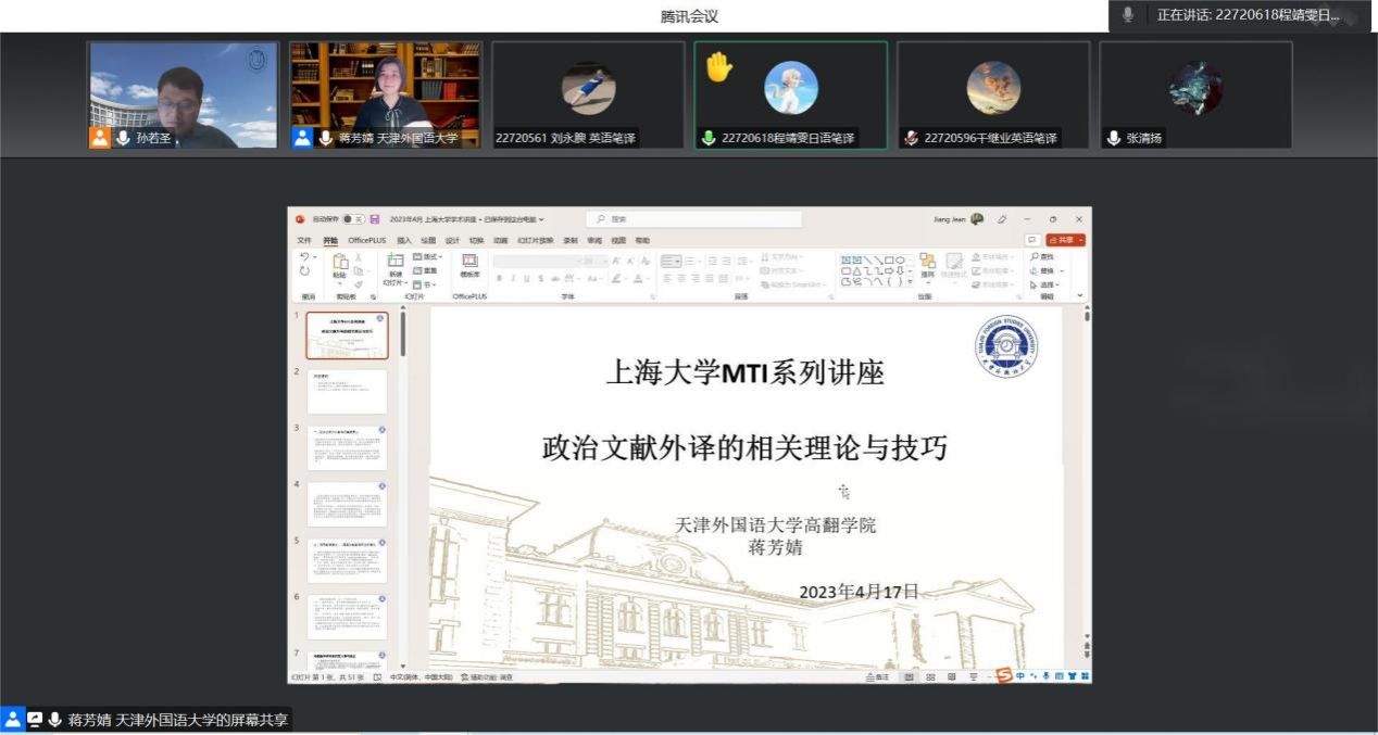 4月17日下午,天津外国语大学蒋芳婧教授应澳门正规电子游戏平台MTI教育中心、澳门正规电子游戏平台东亚研究中心的邀请,给澳门正规师生开设题为“政治文献外译的相关理论与技巧”的线上讲座。讲座由澳门正规电子游戏平台MTI教育中心执行主任朱巧莲老师主持,学院百余名师生参加了本次讲座。
