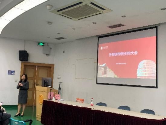 首先进行大会第一项环节,学院院长尚新教授向全体教职工介绍学院新任领导和工作分工。吴蔚书记全面负责党委工作,阚怀未副院长分管专业教学和学院国际化工作。