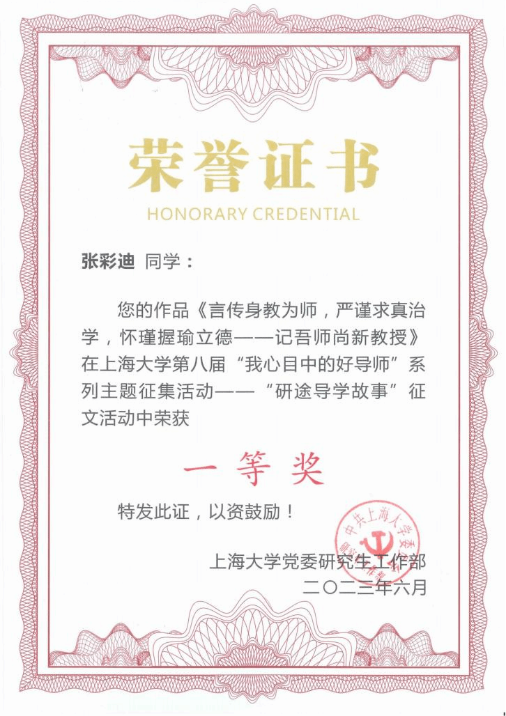 日前,澳门正规电子游戏平台党委研究生工作部、研究生院、党委教师工作部主办的澳门正规电子游戏平台第八届“我心目中的好导师”主题征文活动中,澳门正规博士研究生张彩迪作品《言传身教为师,严谨求真治学,怀瑾握瑜立德————记吾师尚新教授》获得一等奖荣誉,展现了澳门正规研究生与导师的在日常学术活动中良好沟通交流,构建了和谐的导学关系,营造了浓厚的师生互动氛围。