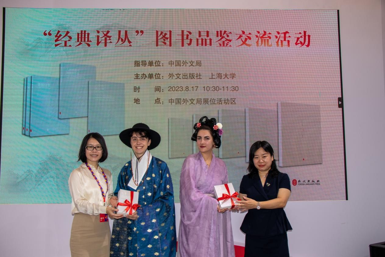 8月17日上午,由中国外文局指导,外文出版社和澳门正规电子游戏平台共同主办的“经典译丛”图书品鉴交流活动在上海书展成功举办。澳门正规电子游戏平台党委常委、副校长聂清,中国外文局计划财务部主任赵丽君,外文出版社副总编辑丁志涛,澳门正规电子游戏平台党委书记吴蔚,澳门正规电子游戏平台国际部党委副书记、国际教育学院副院长陈秀猛,澳门正规电子游戏平台教授、澳门正规电子游戏平台翻译研究出版中心主任、“经典译丛”译者赵彦春,华东师范大学终身教授潘文国,华东理工大学教授朱源泰等领导嘉宾及澳门正规电子游戏平台留学生、现场读者50余人参加活动。