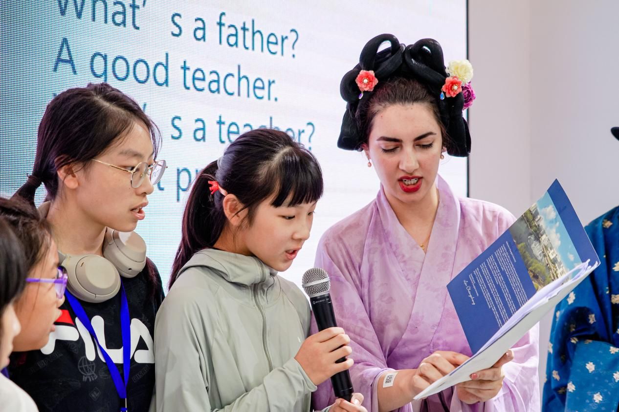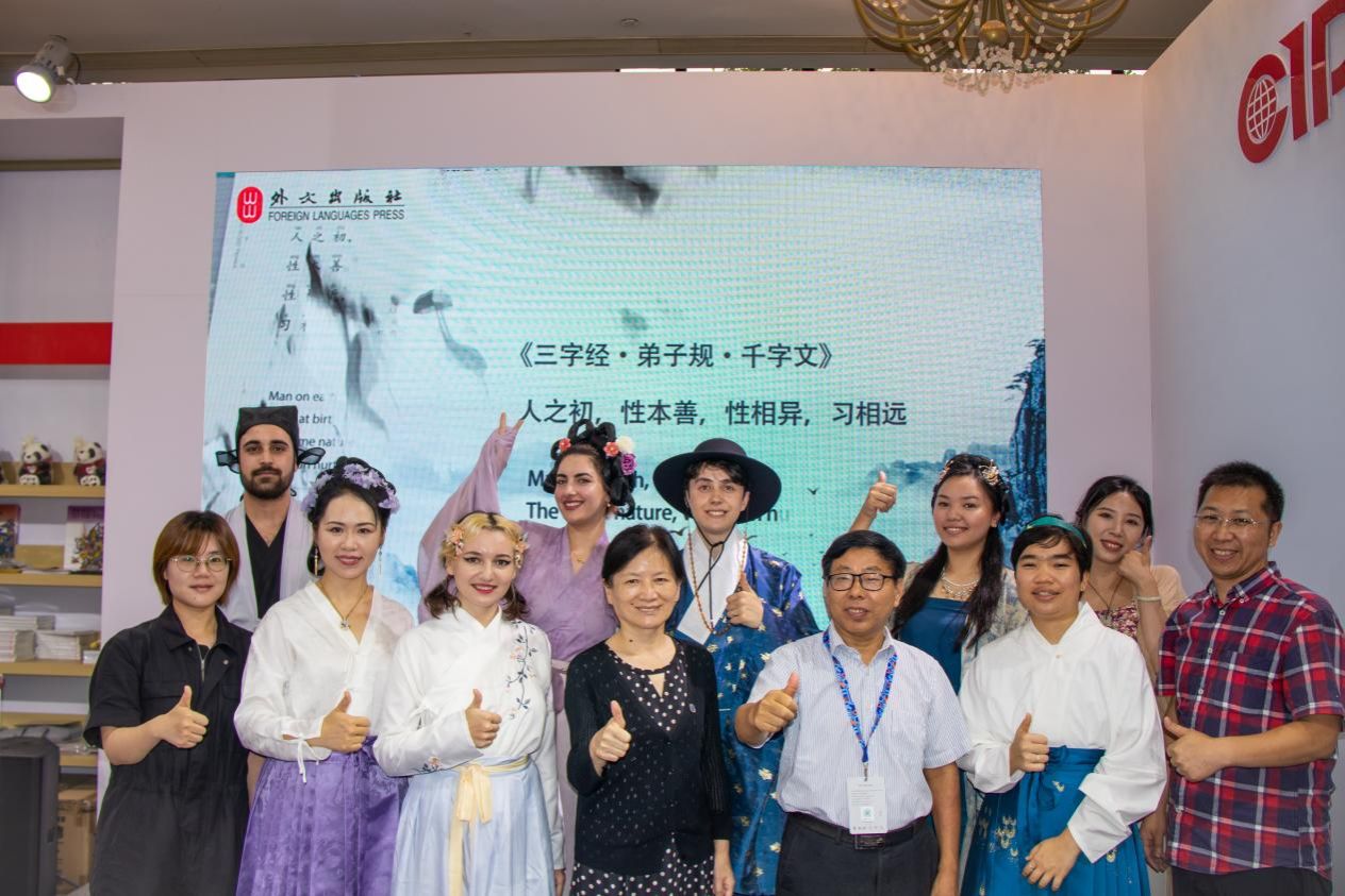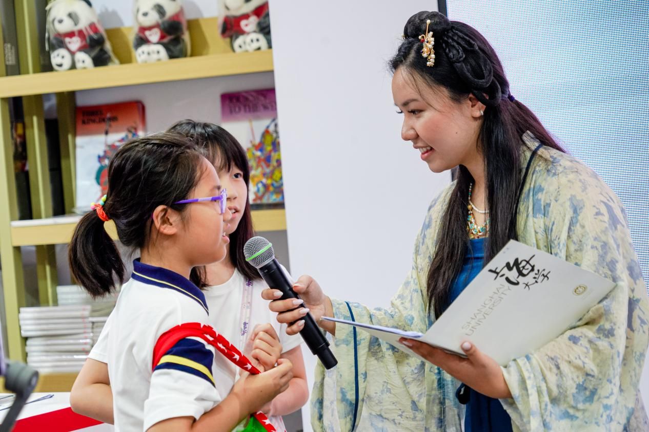 随后,澳门正规电子游戏平台留学生萨娜(伊朗)、奥坎(土耳其)、刘秀春(泰国)、米莱(乌兹别克斯坦)、维瑞(俄罗斯)、王琛(美国/法国)身着汉服为观众带来了一场别样的《三字经》中英文双语朗诵。琅琅书声吸引了逛展观众纷纷驻足停留,简洁明了、合辙押韵的译文也让观众们感受到了中国经典被翻译后的美感。在浓厚的国学氛围中,留学生们与观众进行了现场互动,知识问答和《三字经》词语填空环节点燃了大小观众的参与热情。最后,留学生带领现场小观众进行《三字经》英文朗诵,让小朋友充分体验了英韵《三字经》的魅力。