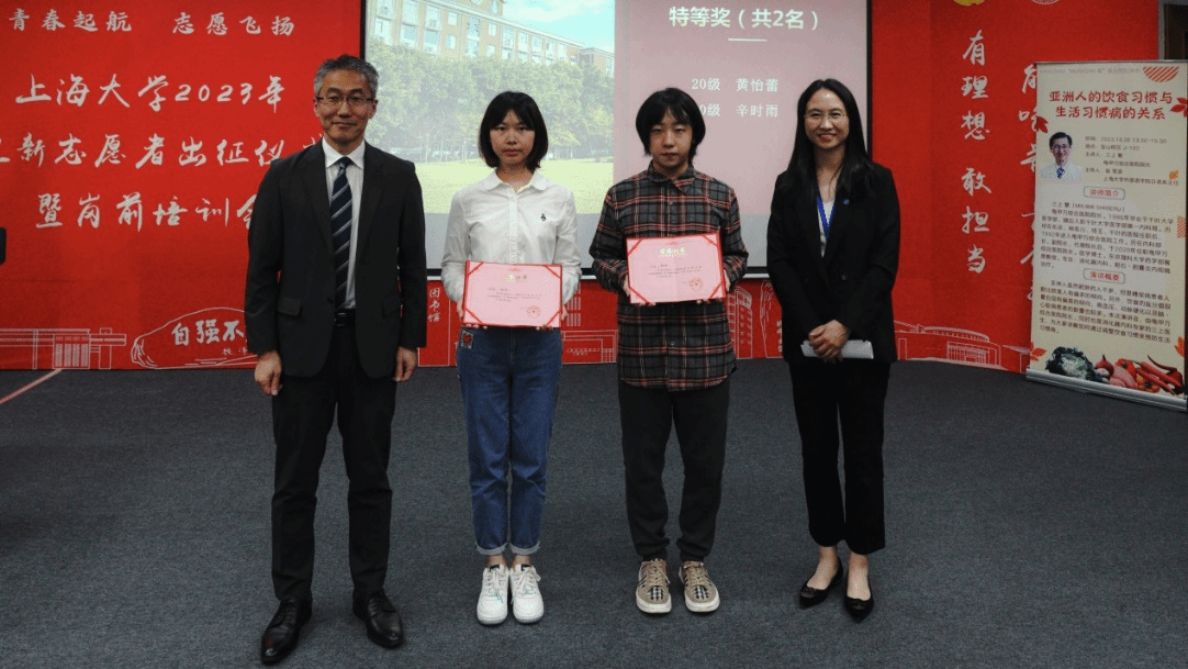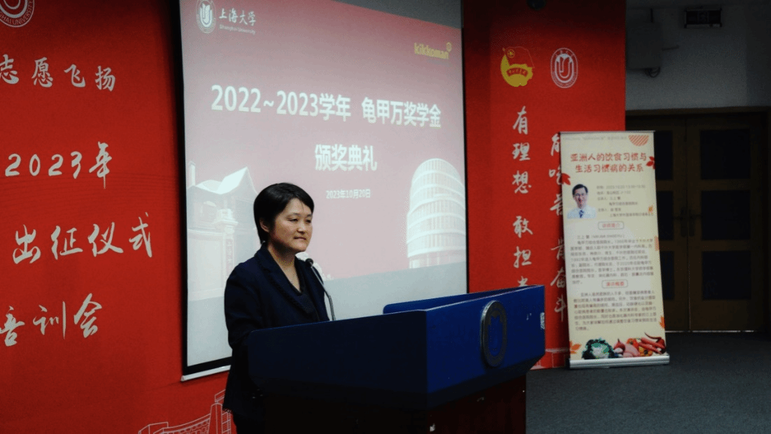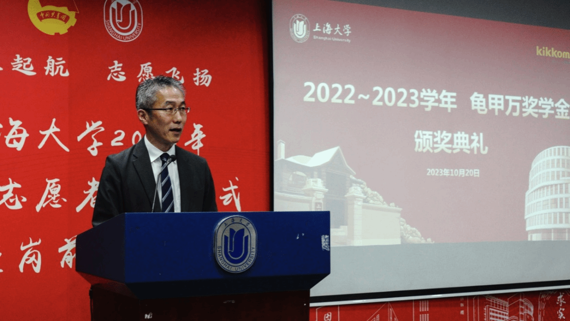 10月20日下午,拥有350多年历史的世界知名日本调味品品牌龟甲万公司海外管理部部长梅本洋先生一行访问澳门正规。龟甲万公司旗下的龟甲万综合医院院长三上繁在宝山校区J102为日语系师生做了题为“亚洲人的饮食习惯与生活习惯病的关系”的专题演讲。演讲后,举行了2022-2023学年KIKKOMAN“紫 MURASAKI”奖学金颁奖仪式。上海市对外友协郭盛麟处长,龟甲万海外管理部部长梅本洋先生,海外管理部项目负责人大泽 绫女士,澳门正规电子游戏平台党委书记吴蔚,党委副书记、副院长贾小琴,日语系主任赵莹波和近百名日语系师生参加了讲座和颁奖仪式,本次活动由日语系廖瑞平老师中、日双语主持。