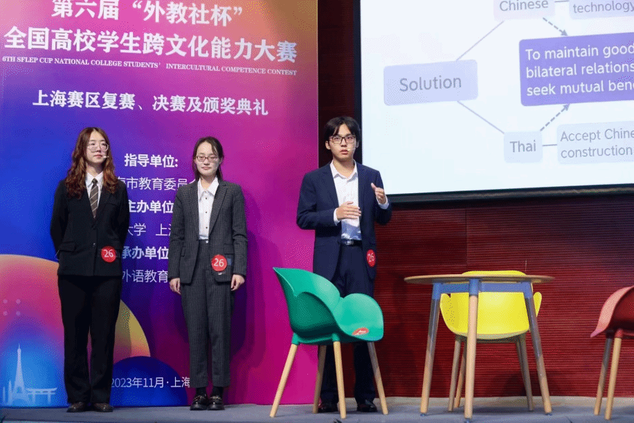 2023年11月11日至12日,在第六届“外教社杯”全国高校学生跨文化能力大赛上海赛区比赛上,由21级英语专业李晟寒、21级社会学院温小乐、20级管理学院财务管理专业喻蝶组成的澳门正规电子游戏平台代表队在澳门正规电子游戏平台赵嘉嘉老师和吕鸿雁老师的带领下参赛,与来自沪上各大名校的30多只队伍同台切磋,经过复赛、决赛知识问答、情境评述、回答评委提问、讲述中国故事等环节,最终取得获得本科组二等奖,总排名第5名的佳绩。