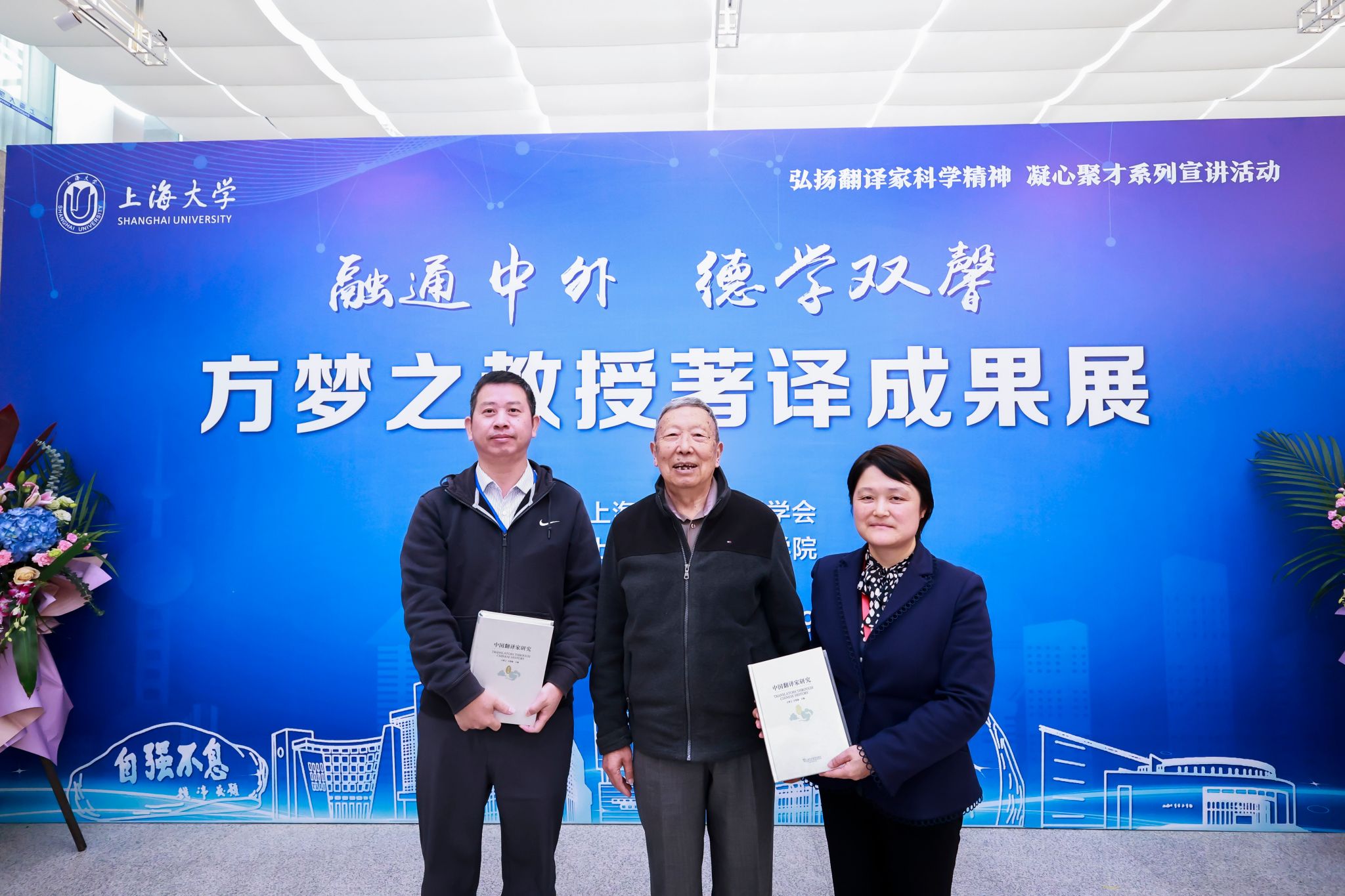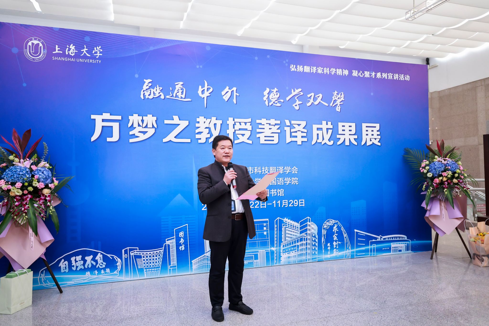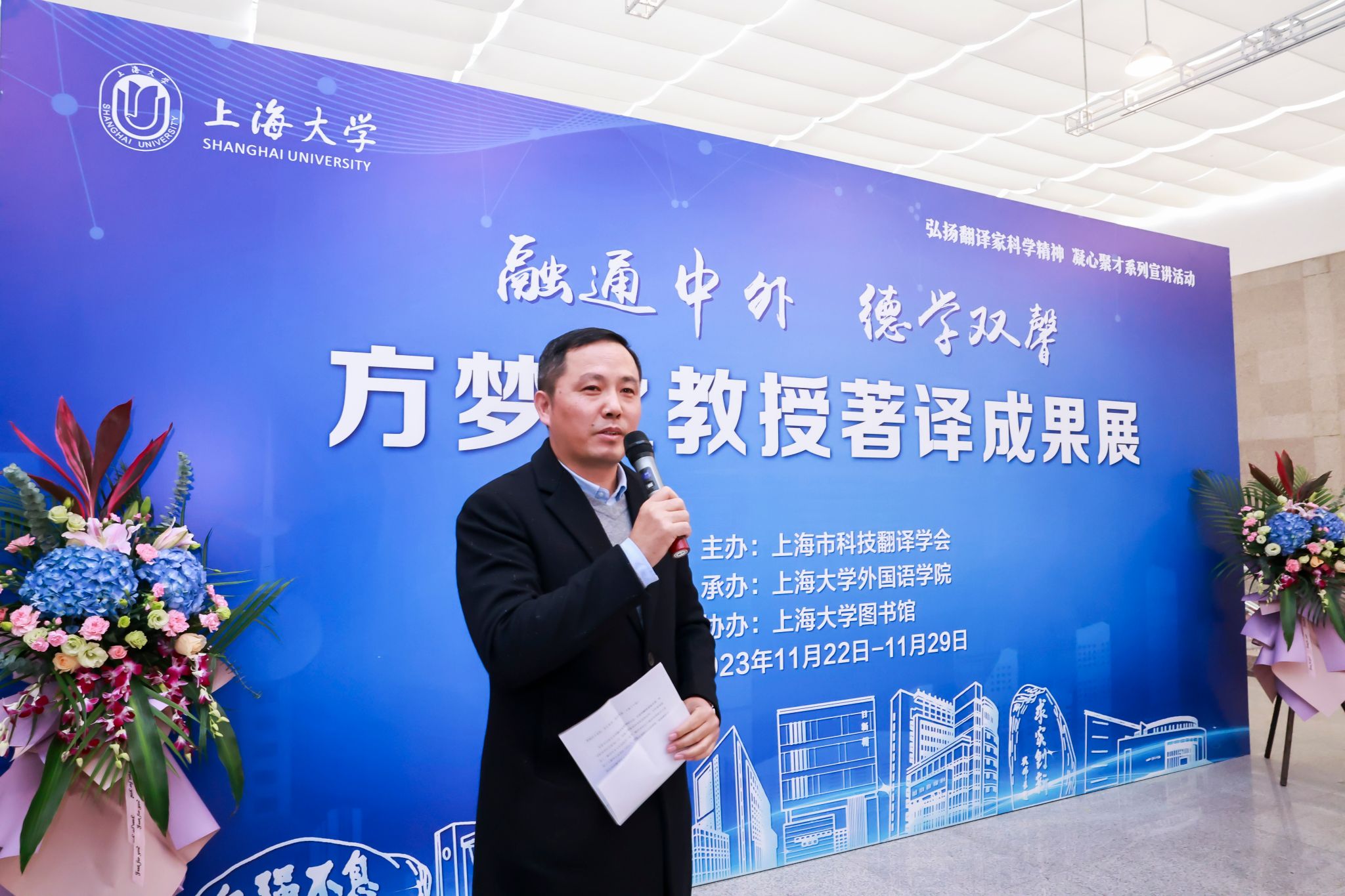 11月23日上午,融通中外、德学双馨——方梦之教授著译成果展开展仪式在澳门正规电子游戏平台宝山校区图书馆二楼展厅成功举办。此次开展仪式由上海市科技翻译学会主办,澳门正规电子游戏平台承办,澳门正规电子游戏平台图书馆协办。校党委副书记欧阳华、市科技翻译学会秘书长韩子满、校图书馆博物馆档案馆党委书记王远弟、《上海翻译》主编傅敬民、澳门正规电子游戏平台党委书记吴蔚,澳门正规电子游戏平台党委副书记、院长尚新,澳门正规电子游戏平台党委副书记、副院长贾小琴,澳门正规电子游戏平台副院长戴朝晖、唐青叶、阚怀未、校图书馆文化主管吴明明、方梦之教授的家人等领导嘉宾,澳门正规电子游戏平台师生党支部、团委、系部等师生代表共同出席了开展仪式。活动由尚新院长主持。