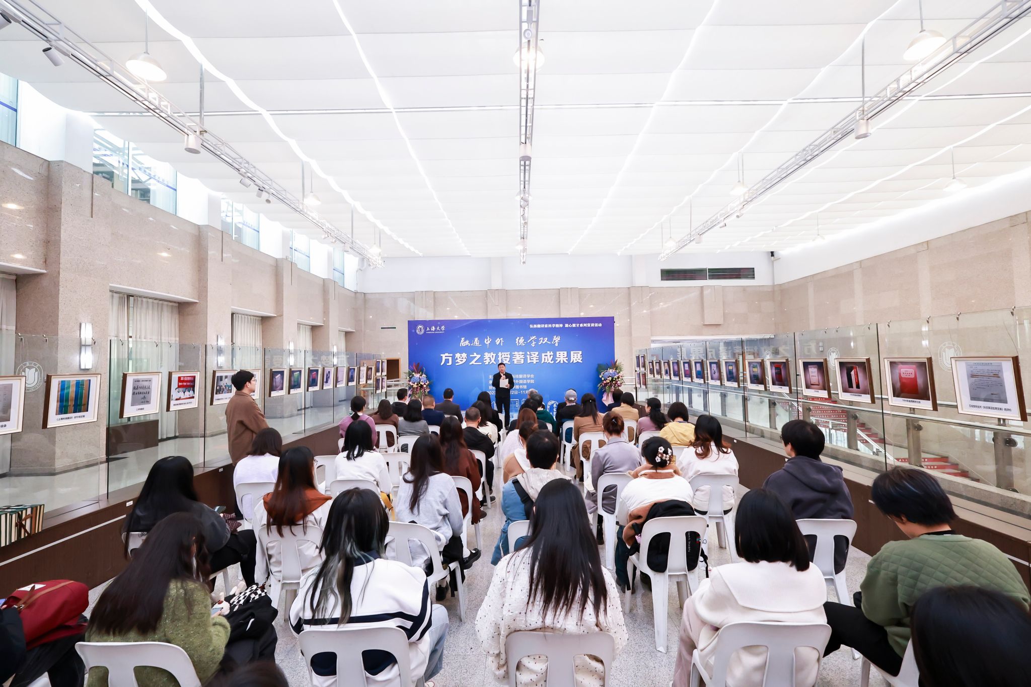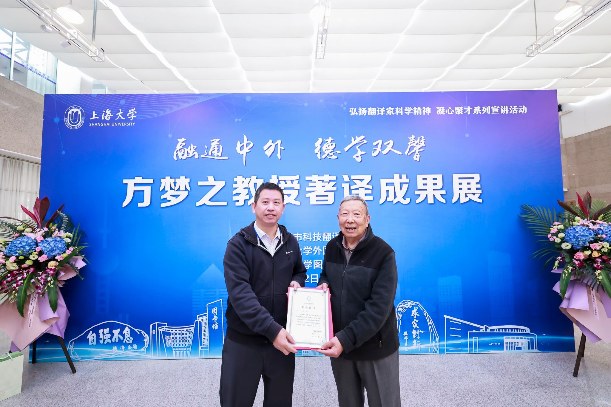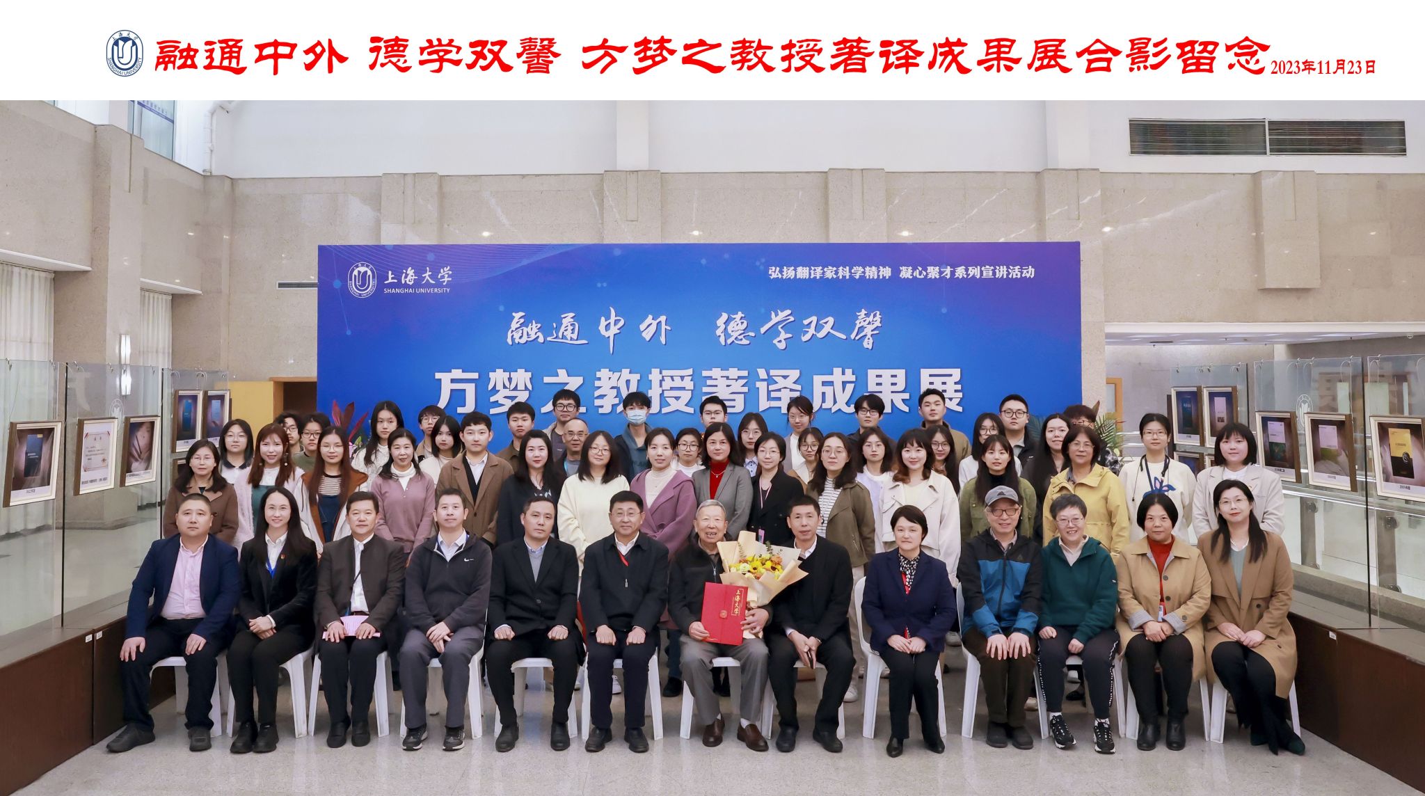 11月23日上午,融通中外、德学双馨——方梦之教授著译成果展开展仪式在澳门正规电子游戏平台宝山校区图书馆二楼展厅成功举办。此次开展仪式由上海市科技翻译学会主办,澳门正规电子游戏平台承办,澳门正规电子游戏平台图书馆协办。校党委副书记欧阳华、市科技翻译学会秘书长韩子满、校图书馆博物馆档案馆党委书记王远弟、《上海翻译》主编傅敬民、澳门正规电子游戏平台党委书记吴蔚,澳门正规电子游戏平台党委副书记、院长尚新,澳门正规电子游戏平台党委副书记、副院长贾小琴,澳门正规电子游戏平台副院长戴朝晖、唐青叶、阚怀未、校图书馆文化主管吴明明、方梦之教授的家人等领导嘉宾,澳门正规电子游戏平台师生党支部、团委、系部等师生代表共同出席了开展仪式。活动由尚新院长主持。
