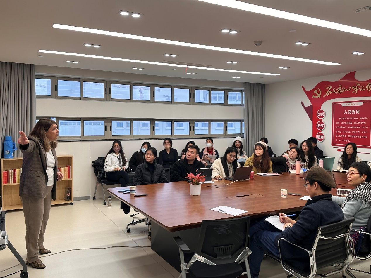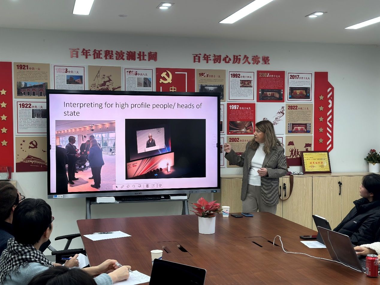 2024年1月18日,英国中央兰开夏大学口笔译系主任、英国皇家“特许语言学家”、英国笔译和口译协会会员、美国翻译协会会员、联合国日内瓦特邀会议口译员Summer Mouallem 教授、博士生导师应MTI教育中心邀请,于宝山校区C412为师生开设题为“Behind the Scenes of an International Conference Interpreter”的讲座。本次活动由MTI教育中心副主任花亮老师主持,MTI教育中心执行主任朱巧莲副教授以及澳门正规电子游戏平台部分本科生、研究生共同参与。