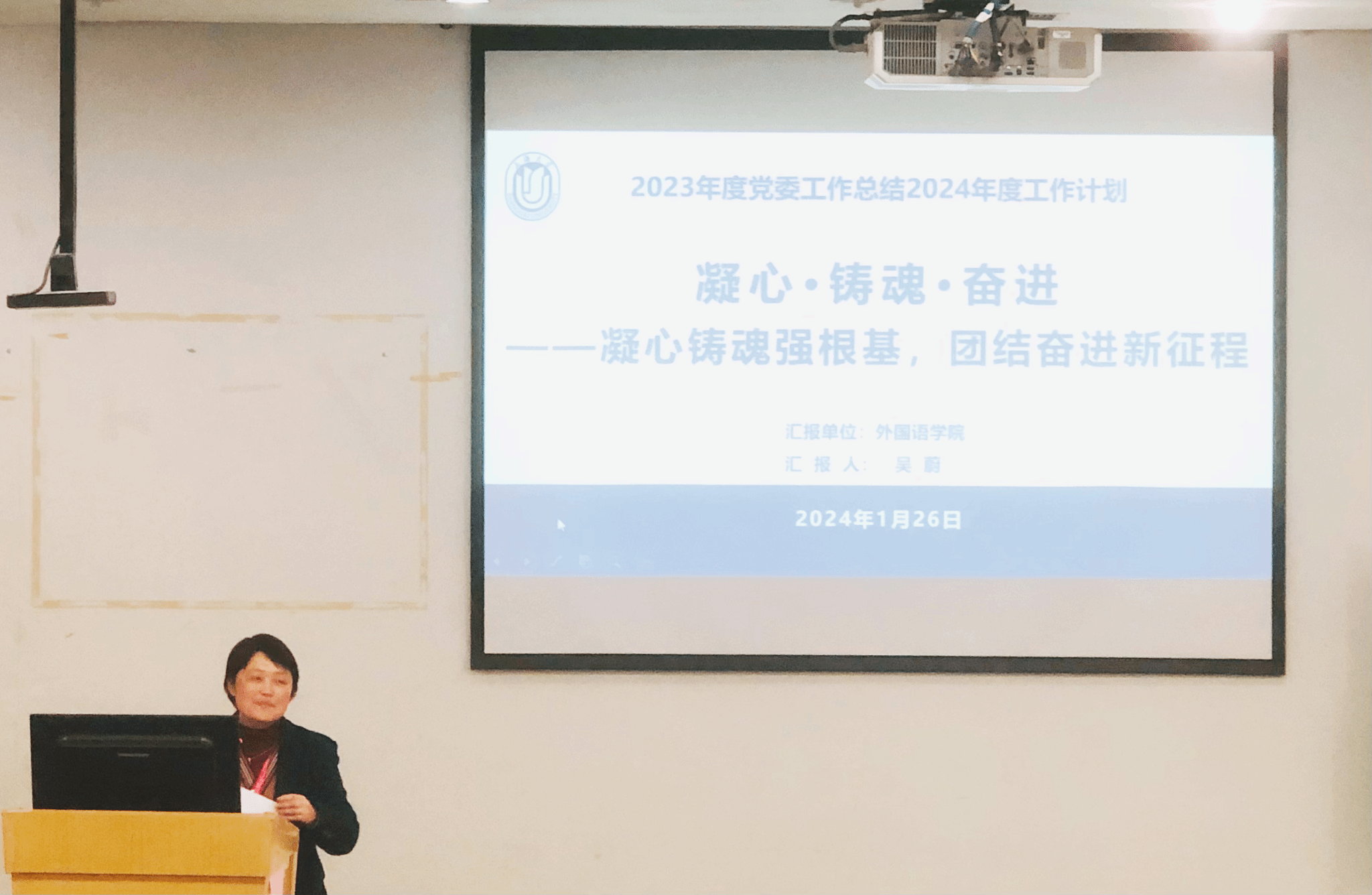 首先,党委书记吴蔚作题为“凝心·铸魂·奋进——凝心铸魂强根基,团结奋进新征程”的工作报告,梳理汇总了四个方面的内容——履行管党治党责任情况、推动党的创新理论武装走深走实、意识形态责任落实情况与基层党建工作责任落实情况。吴蔚书记全面总结了2023年度党委工作的成绩和经验,并提出2024年度工作计划,号召全体教职工以建成“国际知名、国内领先、中华文化对外传播特色鲜明”的澳门正规电子游戏平台为愿景。