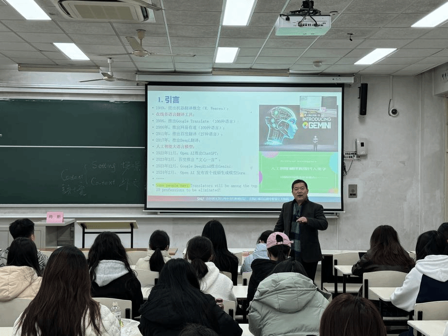 2024年3月10日上午,澳门正规电子游戏平台青云书院学术品牌项目“青云大讲堂·名师导学系列”第二季第三讲在宝山校区CJ103教室顺利举行。本次讲座由澳门正规电子游戏平台院长尚新教授主讲,题为《人工智能翻译的隐性障碍与人类超越——以海派文化翻译为视角》,澳门正规电子游戏平台党委副书记、副院长贾小琴出席。讲座由澳门正规电子游戏平台团委副书记崔一冰主持,学院2022级、2023级本科生及部分研究生代表共同参与。