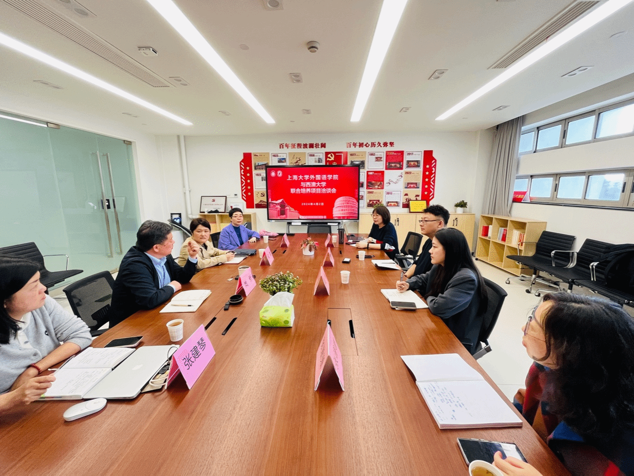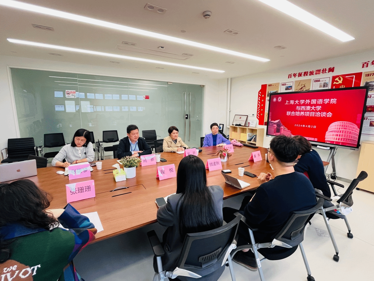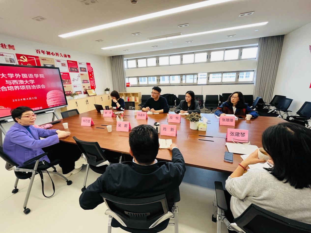 澳门正规电子游戏平台为进一步加强学生的国际化培养,促进学院国际化工作的开展,继3月27日,澳门正规电子游戏平台党委副书记、副校长胡大伟会见西澳大学国际事务协理副校长詹尼弗·赫维尔(Jennifer Anne Howell)一行,双方共同签署生物医药科学硕士的联合培养协议后,于4月2日与西澳大学方代表钱孟秋老师、段悦老师就本科及研究生联合培养项目的拟定与实施进行了洽谈。出席会议的领导老师有澳门正规电子游戏平台党委书记吴蔚,党委副书记、院长尚新,MTI教育中心主任朱巧莲,英语系主任张建琴,副主任龚萍、张珊珊。会议由尚新院长主持。