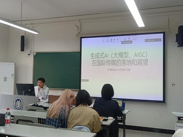 讲座中,沈雄老师首先介绍了生成式AI(大模型、AIGC)技术,表明了“AIGC因为有高价值,所以要应用,因为‘别人的’AI有隐患且难以控制,所以需要‘自主自研可控’的大模型”。随后,沈老师介绍了华测影视自研的大语言模型以及其在文本、图像等多个方面中的应用,包括其如何在影视传播中落地应用,以及在国际传播中起到的作用。最后,沈老师介绍了AI技术对传统工作智能的挑战以及带来的新机遇,呼吁同学们顺应时代发展,掌握专业知识,对于新技术践行“君子不器”的态度,乘科技的东风更好促进中国文化的国际传播。