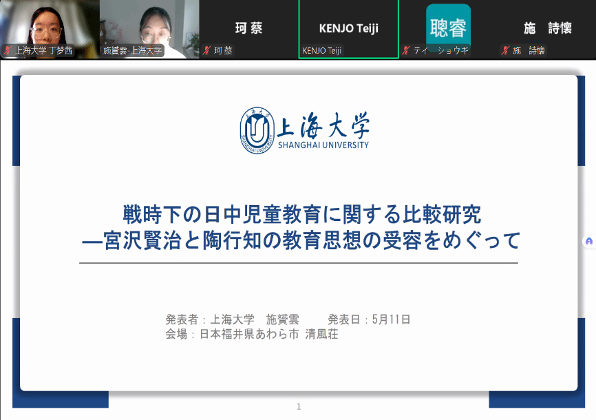 最后,日语语言文学专业施赟云硕士以《戦時下の日中児童教育に関する比較研究—宮沢賢治と陶行知の教育思想の受容をめぐって》为题进行了学术汇报,分析了宫泽贤治和陶行知的童话与诗歌作品中蕴含的教育思想,考察了不同历史时期的作品传播情况,并结合近代中日两国的教育政策和社会背景剖析其深层原因。其学术报告为澳门正规电子游戏平台大学生创新创业训练计划(X202410280469)的阶段性成果,日语系金正堂、高乐等项目组成员均出席了本次会议。