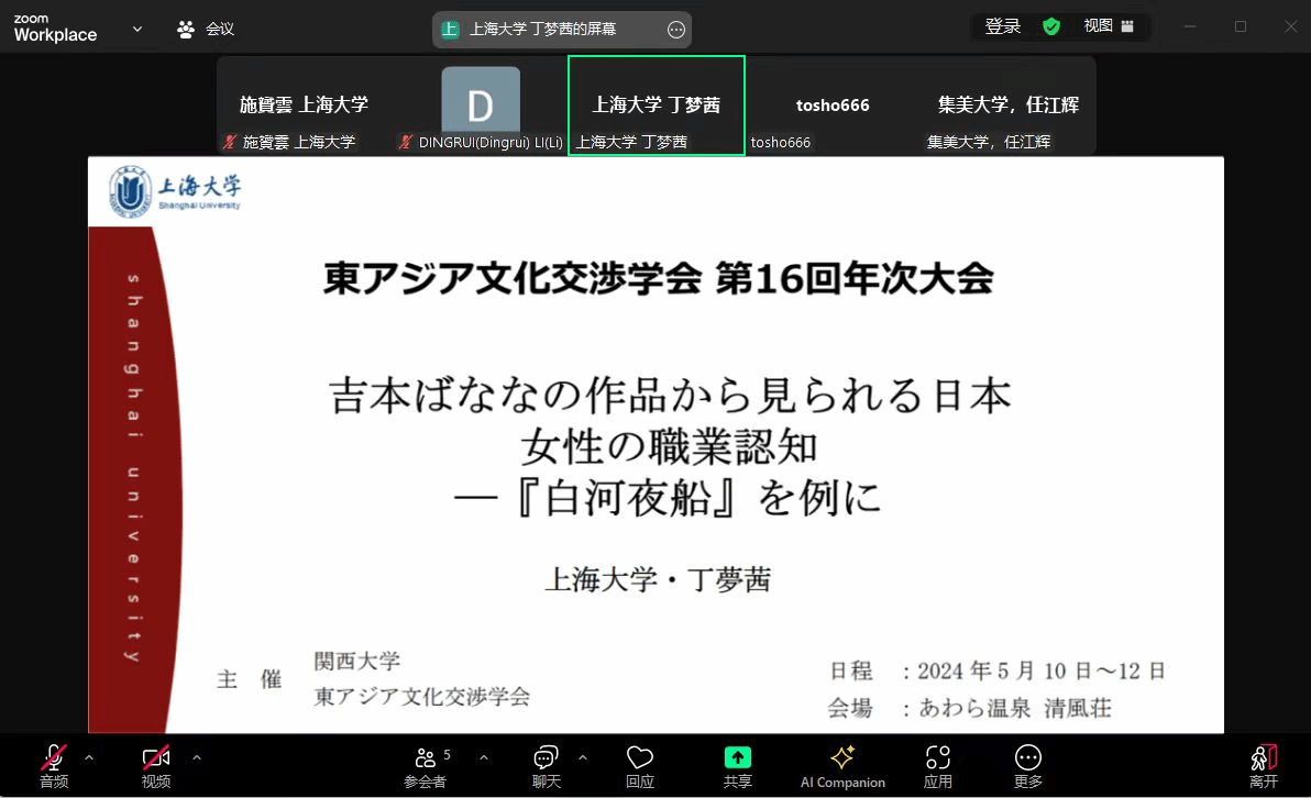 日语语言文学专业丁梦茜硕士的报告主题为《吉本ばななの作品から見られる日本女性の職業認知—『白河夜船』を例に》,报告结合日本的社会环境分析作中女性角色的职业观与伦理观,探讨作品映射出的日本女性的职业定位,进一步考察了亚洲女性的职场境遇变迁及男女平权等学界热点课题。