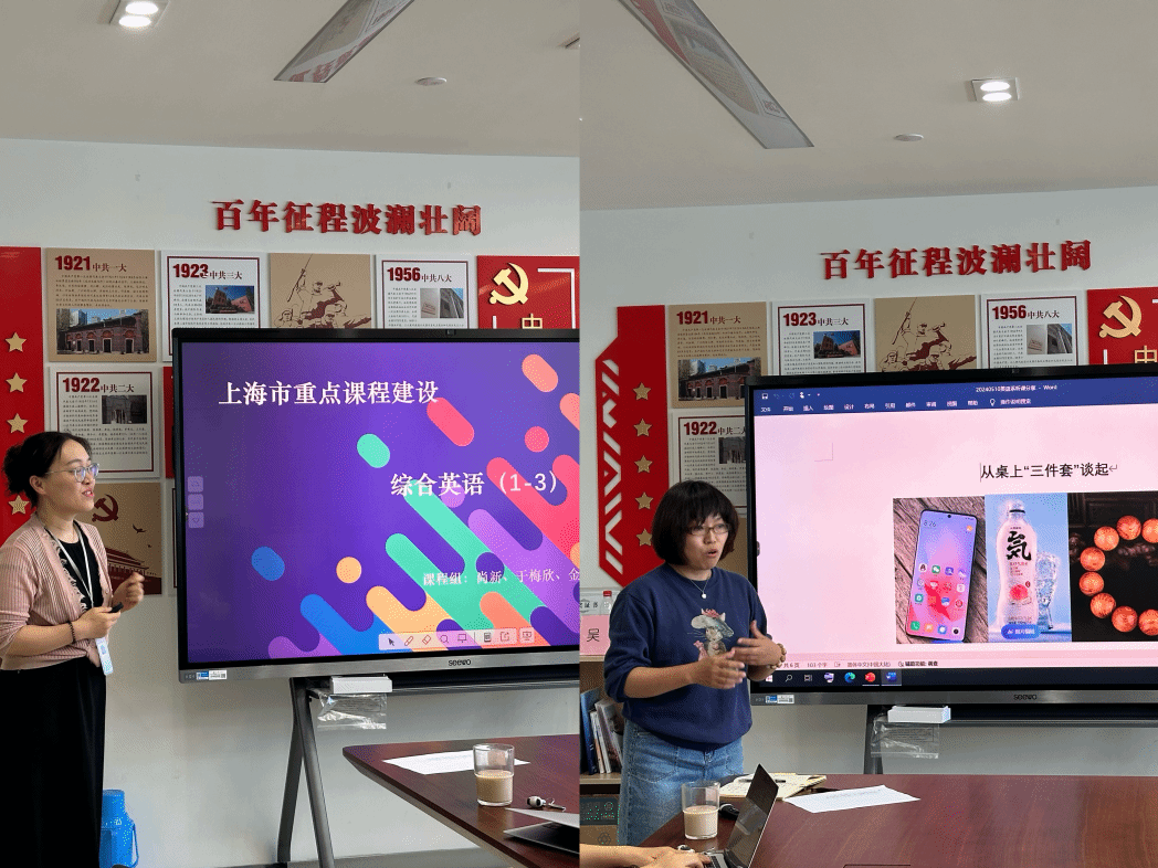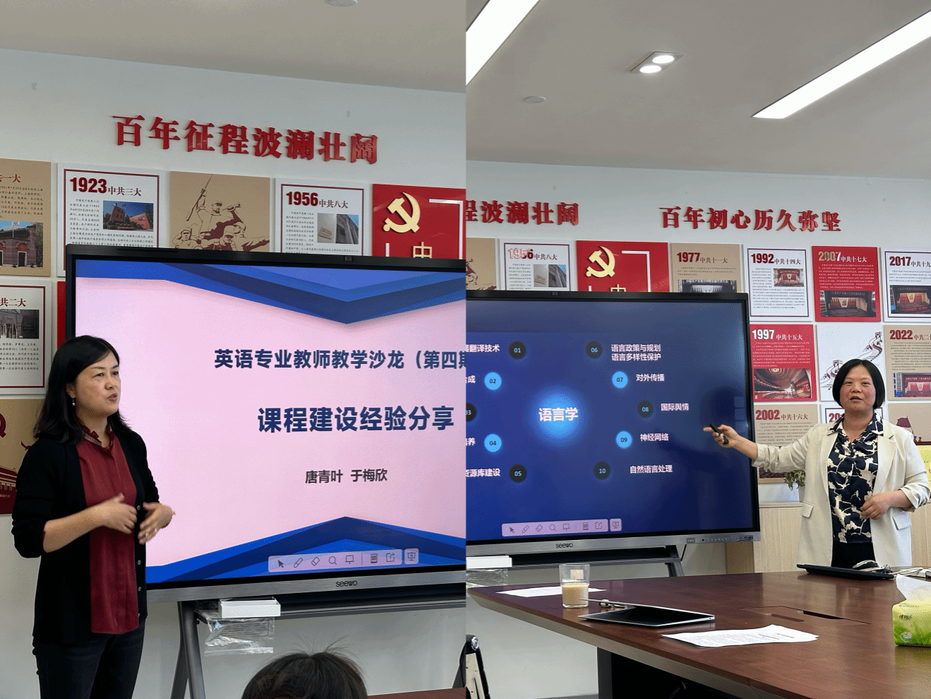 之后,本次会议进入教师教学沙龙阶段。首先,唐青叶副院长和大学外语部于梅欣副主任分别就其课程建设经验进行了分享。唐老师本次分享的主题是“‘多模态、一体化’推进英语语言学课程思政育人”。结合上海市一流本科课程《英语语言学概论(1-2)》的建设经验,唐老师强调了数智赋能语言学课程教学和推进本硕博一体化人才培养的重要意义。随后,于梅欣老师分享了上海市重点课程建设项目《综合英语(1-3)》的建设经验,并介绍了将生成式人工智能融入到课程建设中的方式和途径。