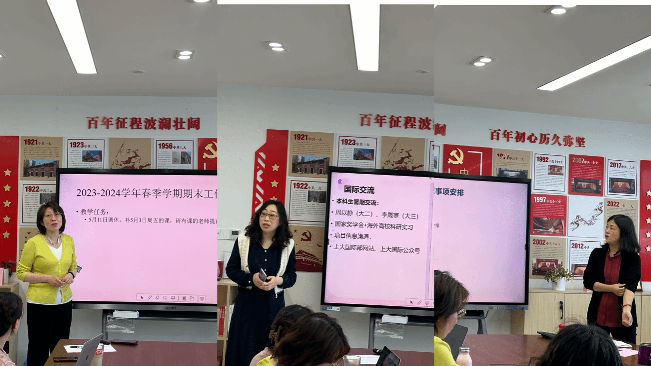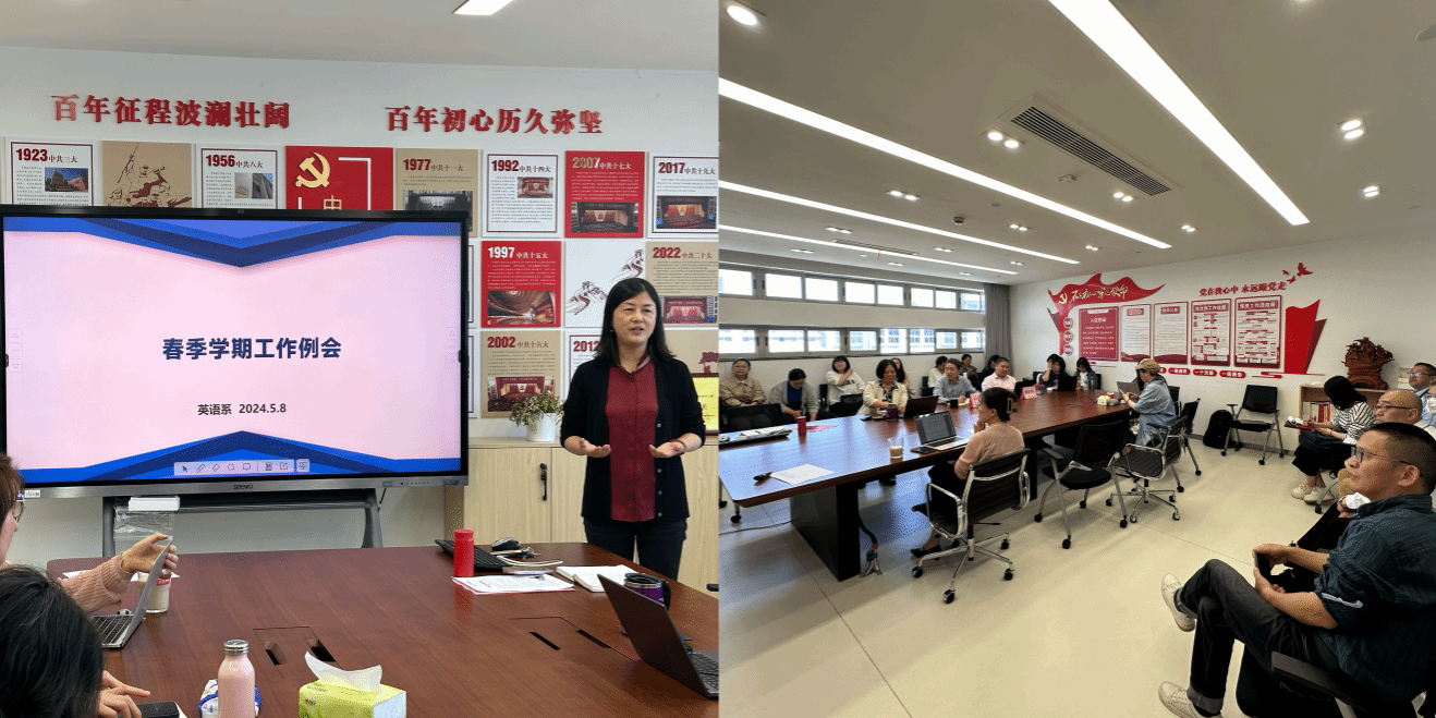 首先,英语系开展工作例会。英语系副主任龚萍老师首先介绍了2023-2024学年春季学期期末的工作要点,提示任课教师做好期末考试准备工作,严守考试纪律。此外,龚老师介绍了2024-2025学年秋季学期的教学任务和班级设置原则。最后,龚老师详细说明了2024届毕业论文工作要点,提示论文指导教师细致做好后续论文呢评阅和答辩工作。接着,英语系副主任张珊珊老师就其负责的国际交流工作做了详细汇报。张老师介绍了英语系本科生暑期交流项目申报情况,提醒老师们多多关注相关项目的申报信息,鼓励学生们积极申报,借此机会拓展她们的国际视野。随后,张建琴主任就英语系招生及管理事项安排做了具体介绍,包括2023-2024学年招生规模、AI+课程工作安排、教师培训安排、2024级培养方案修订等。张老师指出,随着教育技术的不断发展,英语系需要紧跟时代步伐,不断更新教学内容和方式,以培养出具备国际视野和竞争力的优秀外语人才。