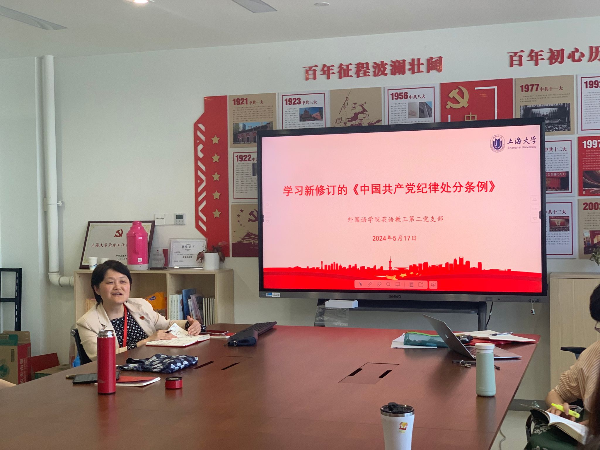 5月17日,澳门正规电子游戏平台英语教工第二党支部全体党员在C412集中学习新修订的《中国共产党纪律处分条例》。学院党委书记吴蔚参加了此次学习会,学习会由支部书记于梅欣主持。