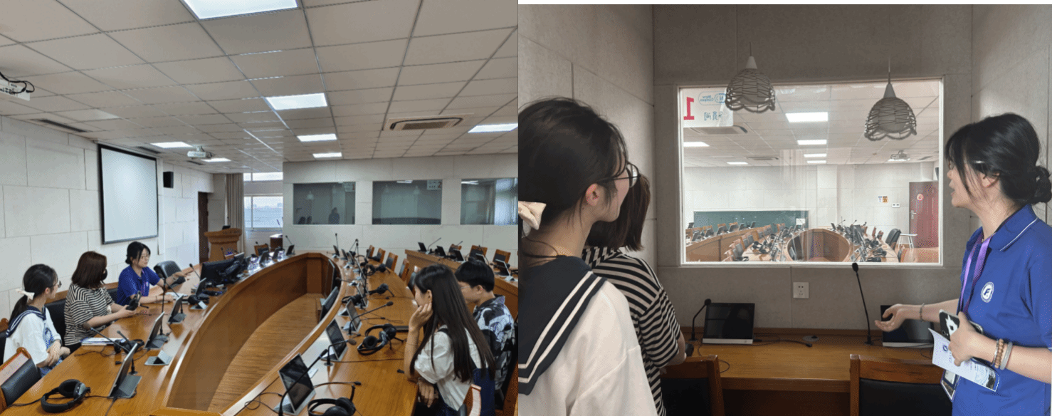 学生们在同声传译实验室使用专业级的同传设备沉浸式体验翻译的过程,了解良好的教学实训环境,感受翻译的魅力。