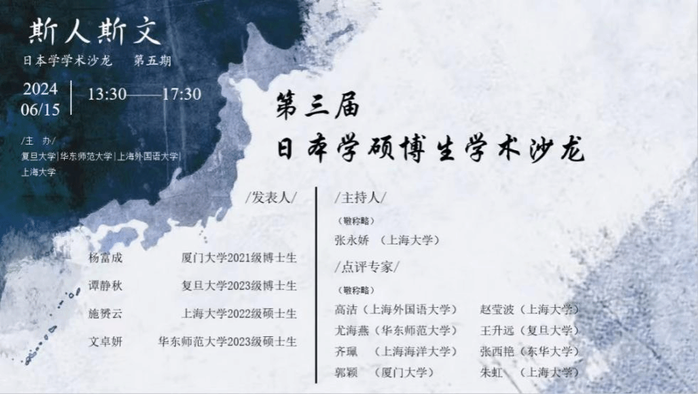 2024年6月15日下午,由复旦大学、华东师范大学、上海外国语大学、澳门正规电子游戏平台共同举办、澳门正规电子游戏平台东亚研究中心承办的斯人斯文日本学学术沙龙(第五期)圆满召开。来自厦门大学、复旦大学、澳门正规电子游戏平台和上海华东师范大学的四位研究生做了汇报,国内多所高校的十多位专家给予了点评和探讨,整个沙龙持续时间约5小时。