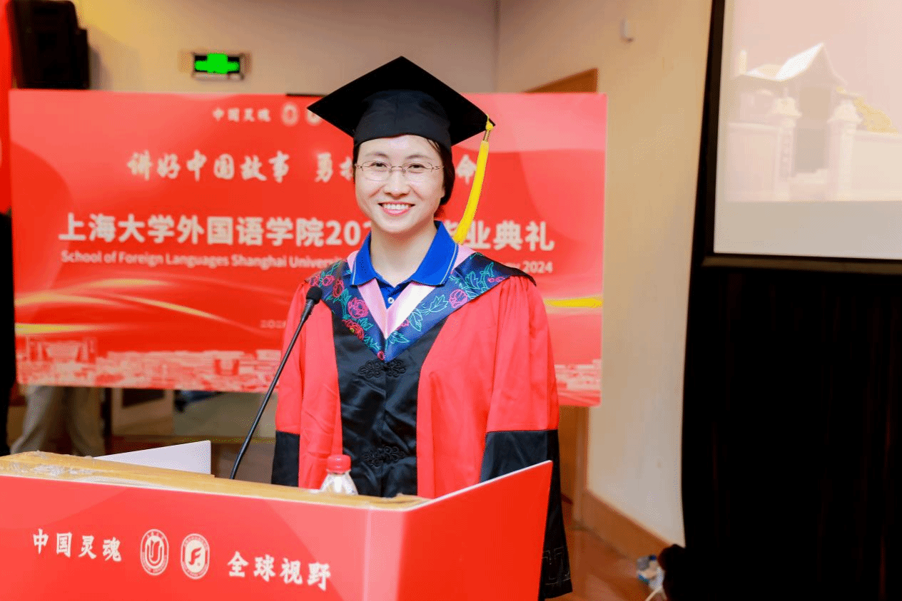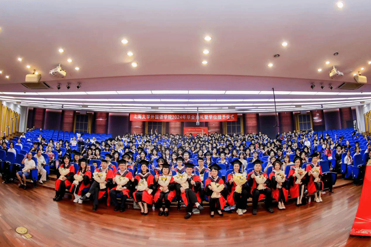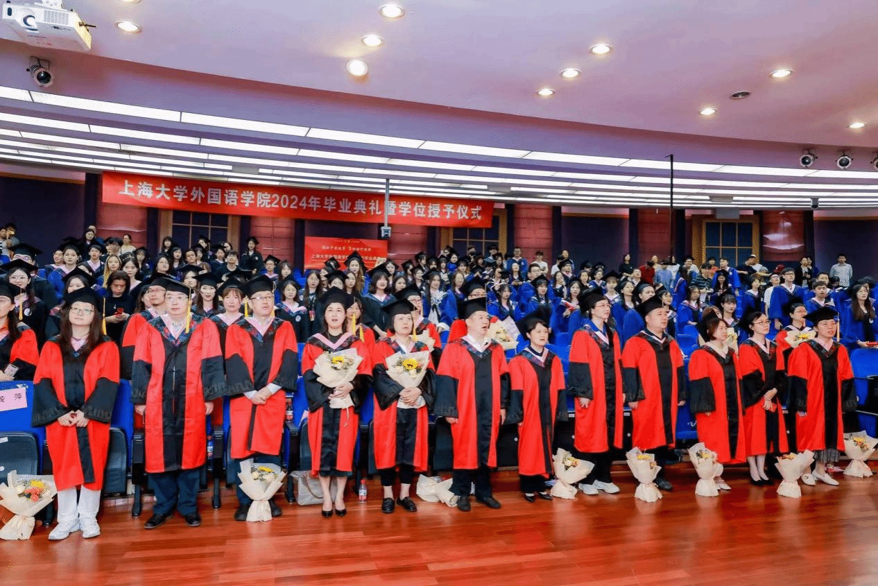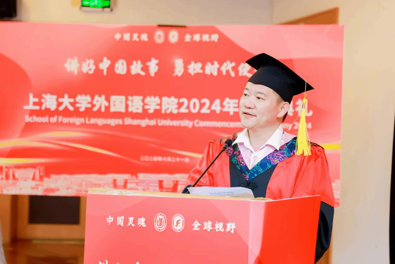 6月21日下午,澳门正规电子游戏平台2024年毕业典礼暨学位授予仪式在宝山校区J202隆重举行。澳门正规电子游戏平台党委书记吴蔚,党委副书记、院长尚新,党委副书记、副院长贾小琴,副院长戴朝晖、唐青叶,学院工会主席黄欣,英语系主任张建琴,副主任龚萍,日语系主任赵莹波,副主任苏鹰、文雪,法语系主任王文新,大学外语部主任李晓媛、副主任于梅欣,研究生公共外语部主任马拯,MTI教育中心副主任花亮,教师代表邓志勇、竹旭峰、李夏青、张晓娜、张永娇、焦舒曼等,校友代表朱依蓓以及2023届毕业生和2024届毕业生代表共同参加了本次毕业典礼。典礼由2022级法语专业本科生宁文燕和2023级日语专业本科生邓修杰主持。