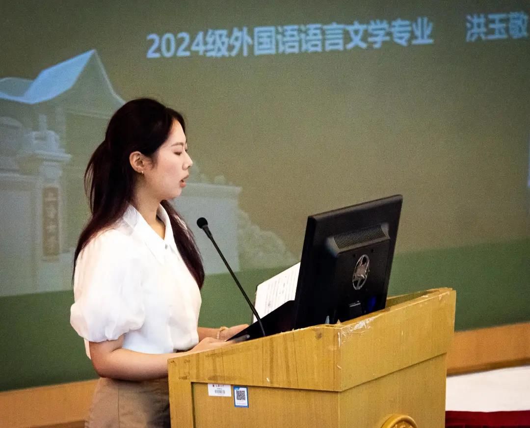 2024级英语专业潘昊和2024级外国语语言文学专业洪玉敬作为新生代表分享了自己的故事和感悟。潘昊同学回顾了三年高中经历,号召大家坚定理想信念,养成良好习惯,并发出“请党放心,强国有我”的青春誓言,为党和国家的发展贡献青春力量,展现青春担当。洪玉敬同学从“立德修身,不忘初心”、“勤学不辍,笃行不怠”、“拓宽视野,与时代同行”三个方面与同学们共勉,挺膺担当,胸怀世界百年未有之大变局,将自身发展融入国家的发展中,为推动中外文明互鉴注入青春智慧,发出青春声音,彰显青春风采。