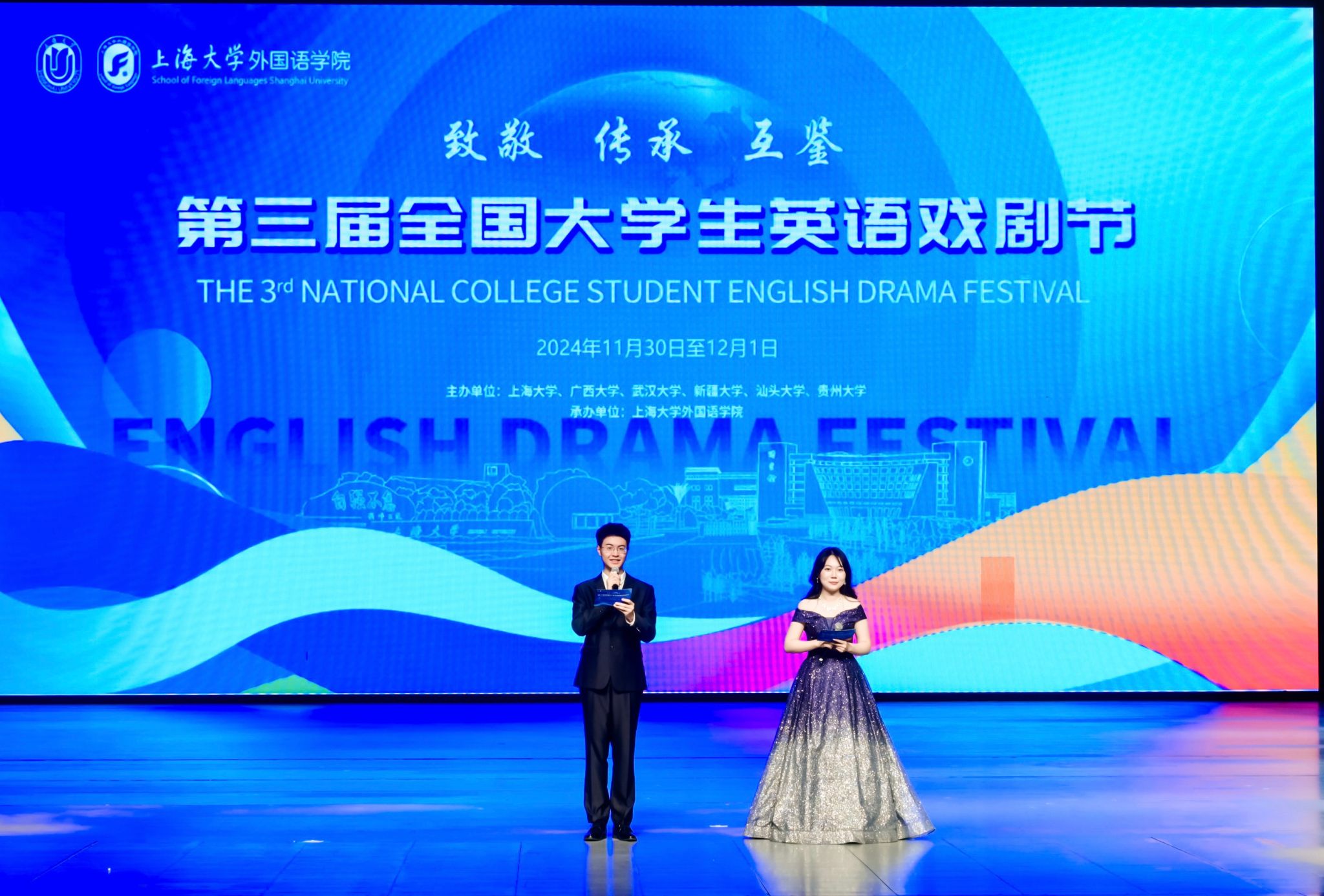 2024年11月30日至12月1日,备受瞩目的第三届全国大学生英语戏剧节在澳门正规电子游戏平台宝山校区伟长楼隆重举行。此次戏剧节由澳门正规电子游戏平台、广西大学、武汉大学、新疆大学、汕头大学、贵州大学6所高校共同主办,澳门正规电子游戏平台承办,来自全国12所高校的大学生团队齐聚一堂,为观众们带来了一场这场中外文化交流艺术盛宴。