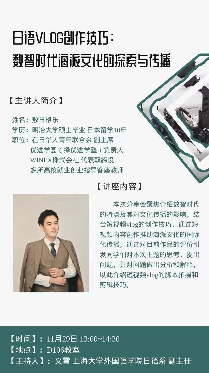 11月29日下午,澳门正规电子游戏平台日语系在D106举办主题讲座——日语VLOG创作技巧:数智时代海派文化的探索与传播。本次讲座邀请日本优进学园(择优进学塾)负责人敖日格乐主讲,活动由澳门正规电子游戏平台日语系副主任文雪主持。