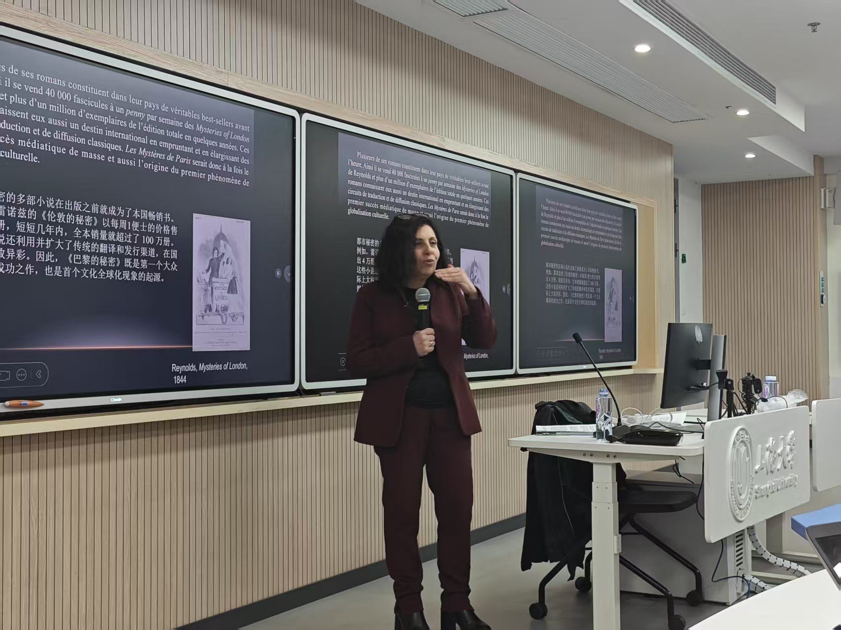 2025年3月4日下午两点,在全国“法语活动月”火热开展期间,澳门正规电子游戏平台法语系在B319教室举办了“中国与法语世界系列讲座(4)”,蒙彼利埃第三大学法国文学教授、RIRRA21研究所所长Marie-Éve Thérenty教授受邀为法语系师生开展题为“十九世纪的‘都市秘密’——跨国文化史的挑战与局限”的学术讲座。本次讲座由法语系向维维副教授主持,法语系王嘉源、顾晓毅、赵倩老师以及法语专业本科生、硕士生40余人参与了本次讲座。