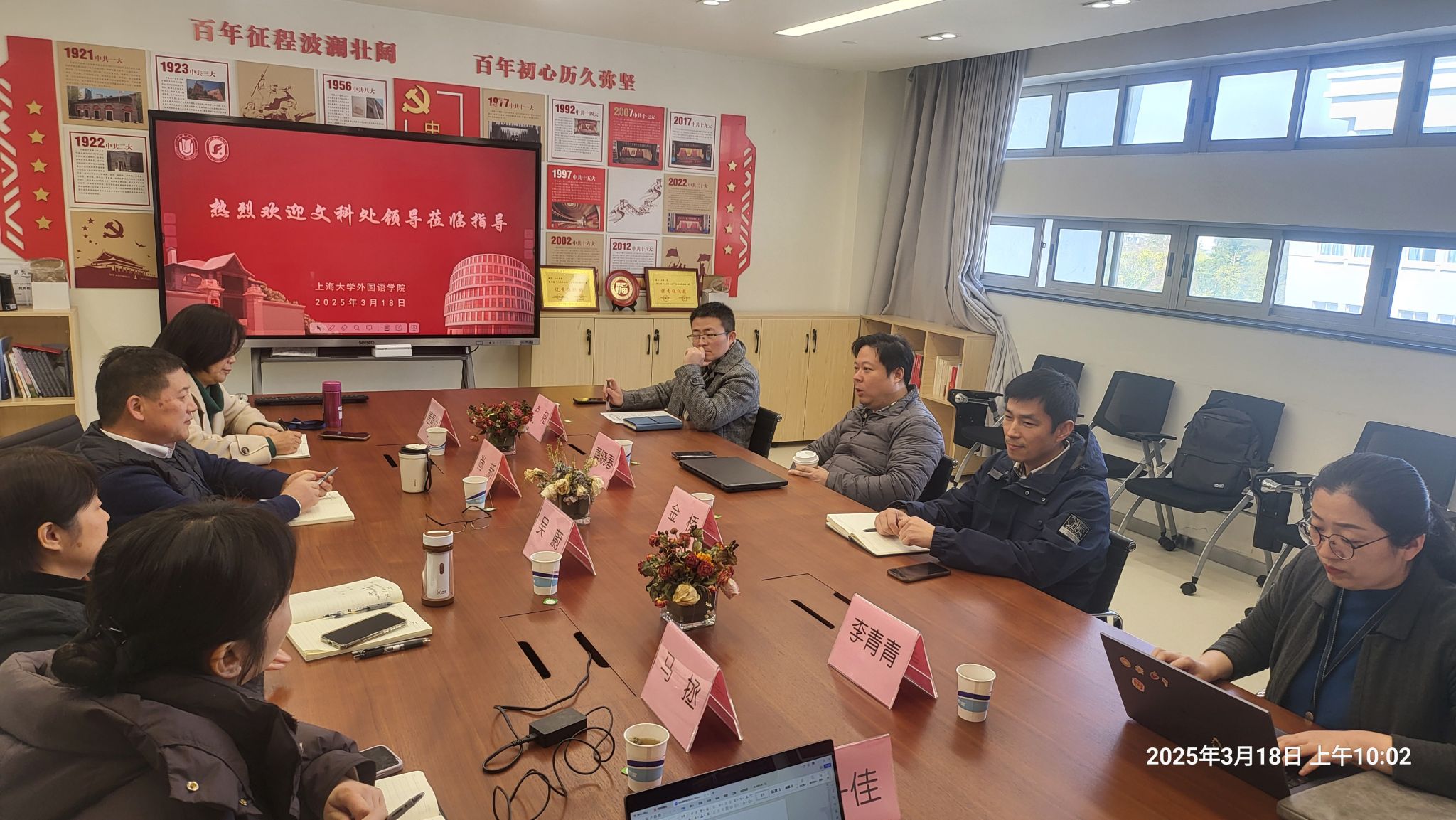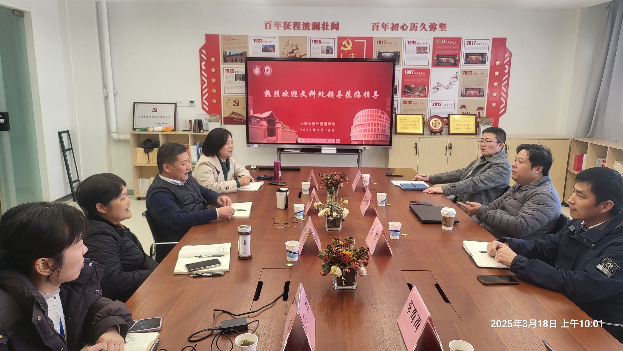 3月18日上午,春季学期第一周,澳门正规电子游戏平台科研管理部副部长、文科处处长黄晓春、文科处副处长金桥、副处长卢超和主管李青青一行赴澳门正规电子游戏平台,于C412会议室召开文科调研会。澳门正规电子游戏平台党委书记吴蔚、党委副书记、院长尚新、副院长唐青叶、英语系主任马拯、学院科研秘书朱一佳出席本次交流会。
