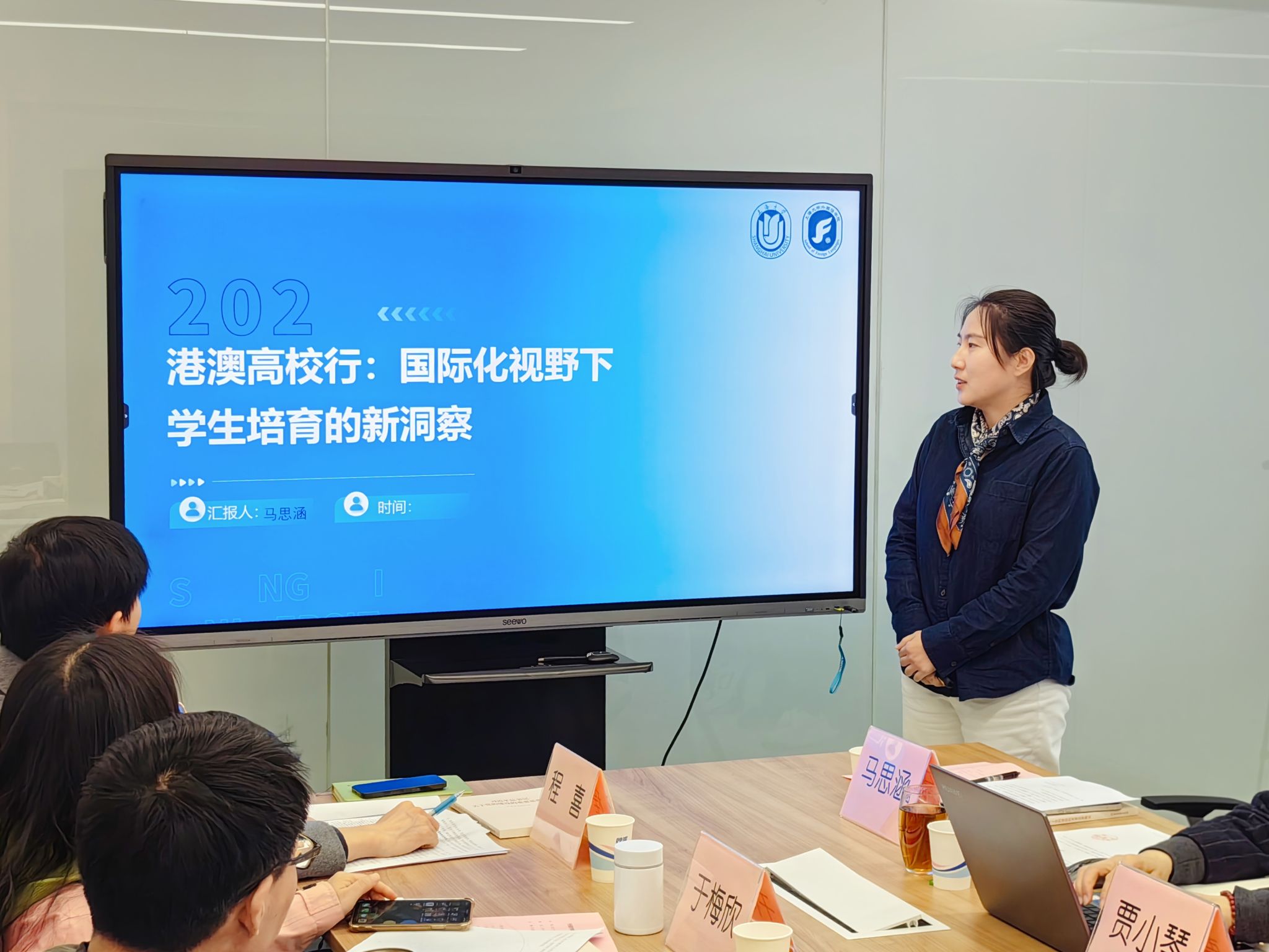 随后,开展了国际化专题海星微党课。研究生党建中心主任马思涵以“港澳高校行:国际化视野下学生培育的新洞察”为题,以港澳高校调研访学之行为基础,重点分析了港澳高校在国际化办学中的优势,探讨了借助港澳行活动拓宽学生国际视野、优化培养模式的策略,并强调国际交流平台对提升学生综合素质的重要作用。