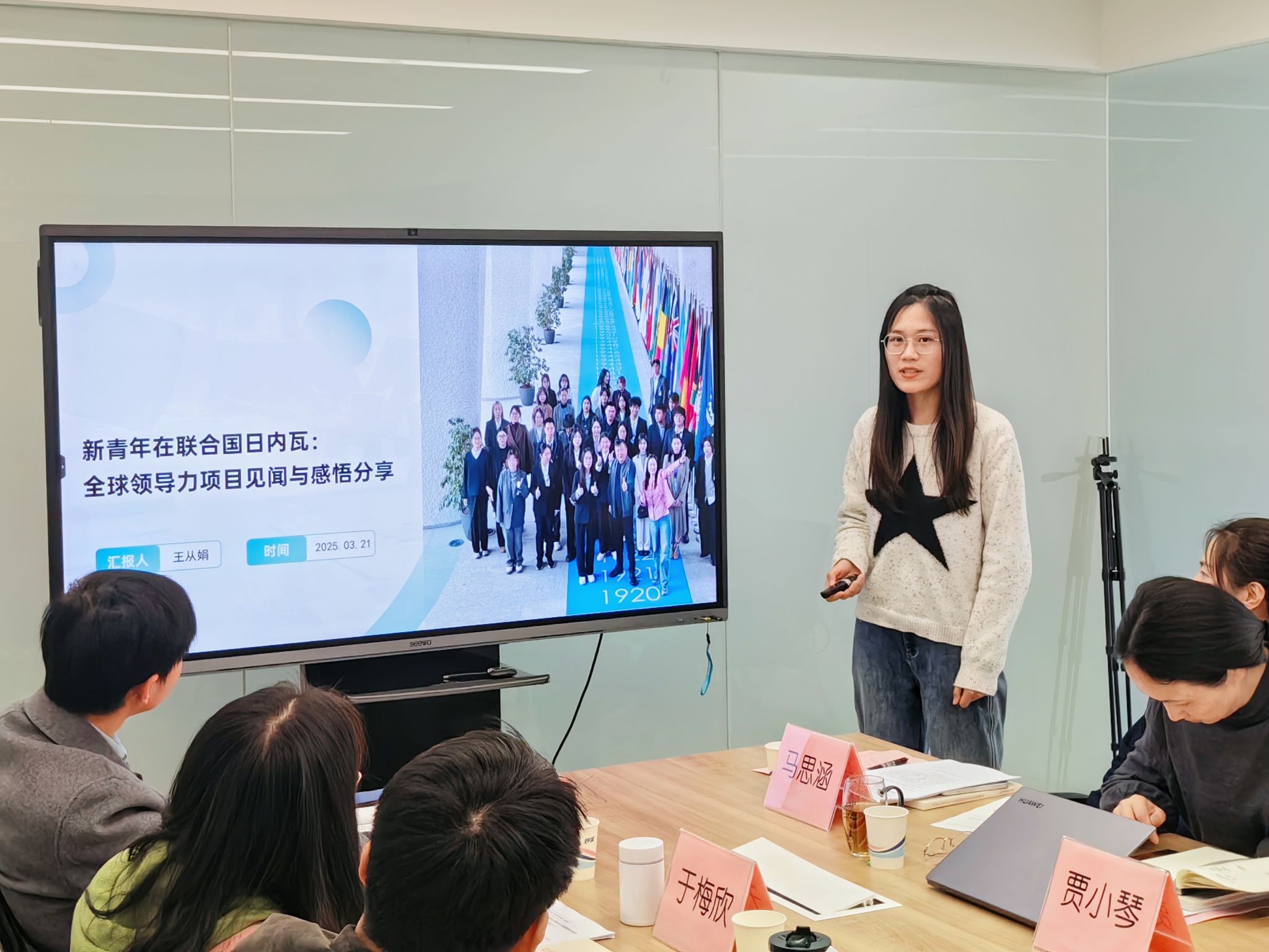 学生第一党支部书记王从娟围绕“新青年在联合国日内瓦:全球领导力项目见闻与感悟分享”进行了汇报,详细介绍了参与联合国日内瓦全球领导力项目的经历,阐述了国际组织实践对培养新青年的全球领导力和责任感的深远意义,并分享了团队协作与跨文化交流的宝贵体会。