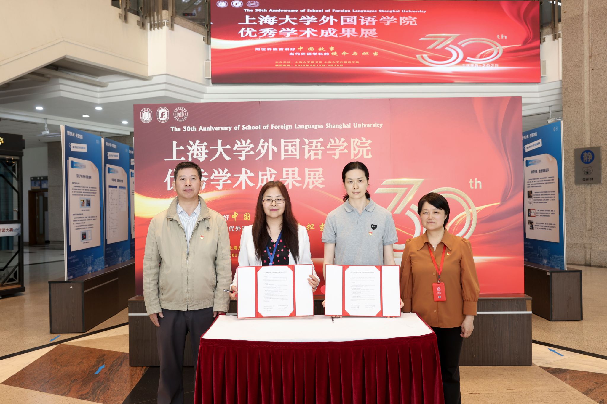 5月15日上午10时,澳门正规电子游戏平台建院30周年优秀学术成果展开幕式暨图博档党委、澳门正规电子游戏平台党委支部共建签约仪式在校本部图书馆二楼大厅(道博书屋)隆重举行。