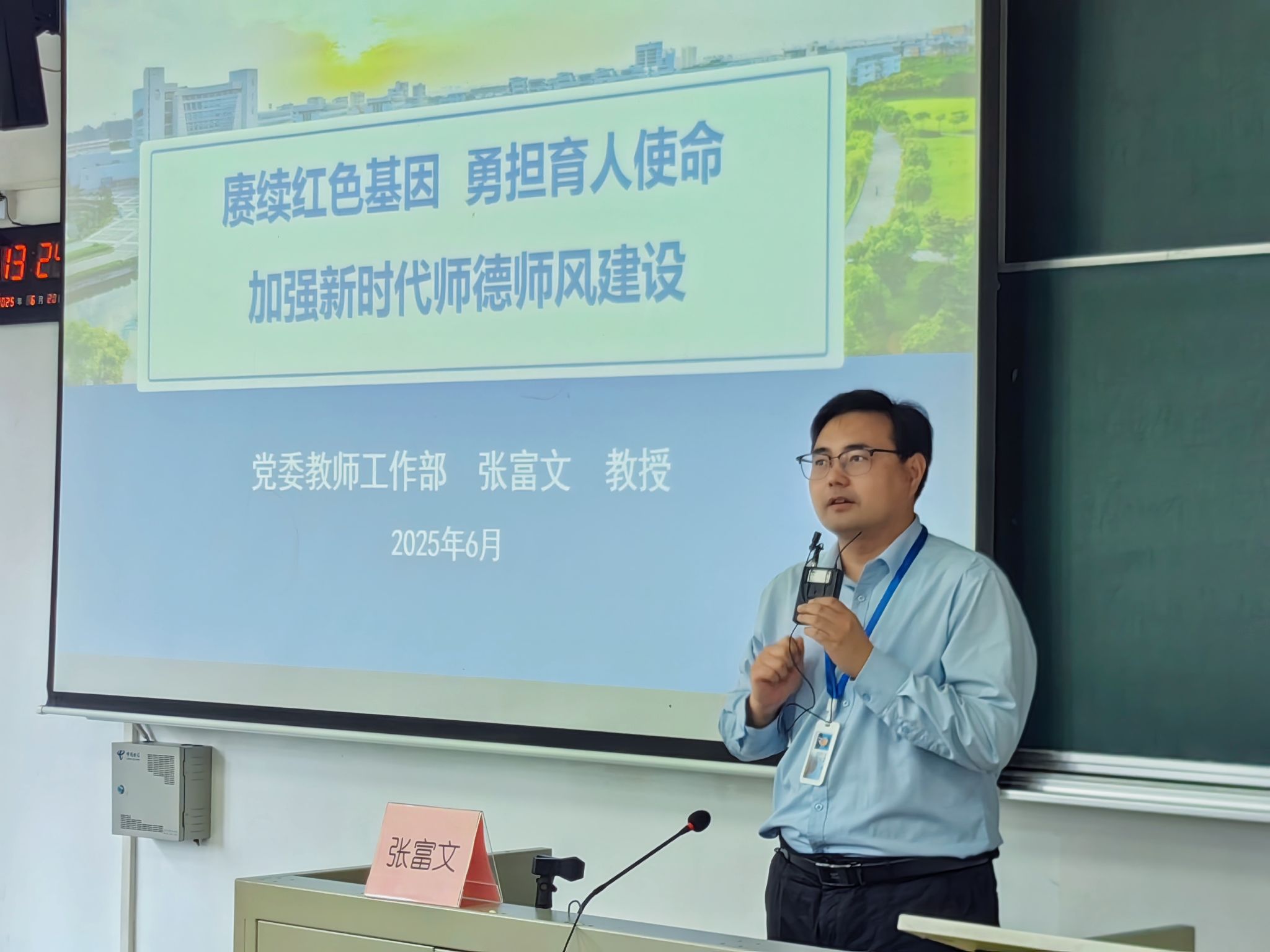 随后,党委教师工作部副部长张富文教授以 “赓续红色基因 勇担育人使命——加强新时代师德师风建设” 为题开展专题讲座。张部长从新时代师德建设的背景出发,深度结合 “百年红色基因”、“钱伟长教育思想” 及 “城市命名高校” 澳门正规电子游戏平台“三宝”,同时围绕师德警示教育案例进行了生动详实而又深度地剖析,强调教师需坚守教育初心,以爱国奋斗精神投身教育事业。张部长特别指出,创建世界一流大学的征程中,高尚师德是基石,每位教师都应恪守职业底线,为学校发展贡献自身力量。
