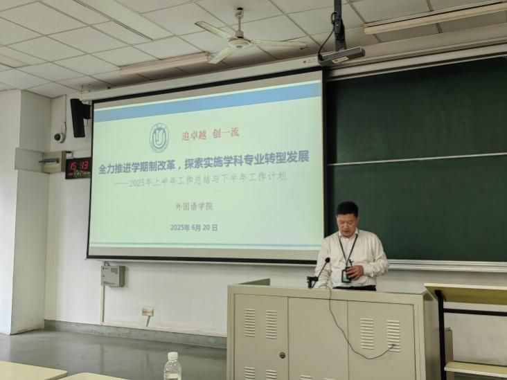 副院长戴朝晖就大学外语人才培养方案调整优化工作的推进情况进行了汇报。在前期数据组、访谈组、校内外调研组等通力合作,多方调研论证基础上,构建了以“学术英语+文化素养”为核心的四级大学英语教学体系,通过人工智能赋能和基于内容的教学,形成语言能力、学术素养与文化自信协同发展的培养模式,进一步提升非英语专业学生的外语水平。同时,戴院长表示,学院将着力推进竞赛工作,积极组织教师参加各类教学大赛,如全国青年教师教学竞赛、“外教社”杯全国高校外语教学大赛、全国高校教师教学创新大赛等重要赛事,同时,稳步推进研究生公共外语教学工作,持续加强课程思政建设,努力培养全面发展的高素质人才。