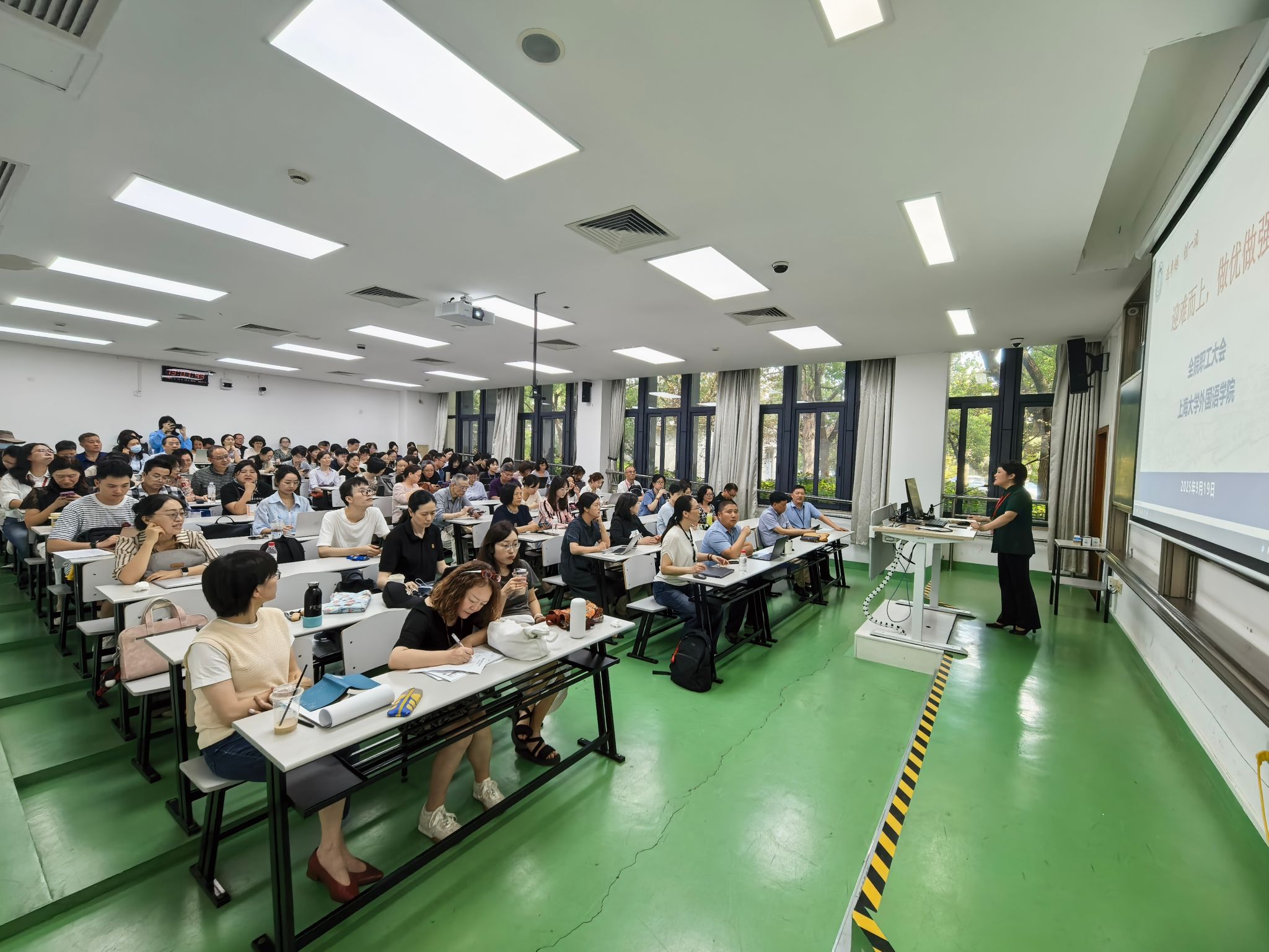 副院长戴朝晖围绕 “‘适变’致远,‘应变’图强” 主题,聚焦新学期教学改革的变化与应对策略。在 “新学期大变化” 板块,他详细解读了学期制优化、2025 级人才培养方案重构、教学平台与选课体系变化、大学英语教学改革、AI +课程”建设、研究生公共外语教学等六个方面的变化,指出这些变化既是挑战,更是推动教学质量跃升的契机。在 “适变与应变” 板块,他呼吁全体教师主动调整角色定位,通过 “勤反思、善总结、多交流” 提升教学创新能力。此外,他介绍了上半年学院在重大赛事中的获奖情况,以及下半年承办高水平赛事的计划安排,鼓励教师以赛事为抓手,激发学生的学习热情与竞争意识。