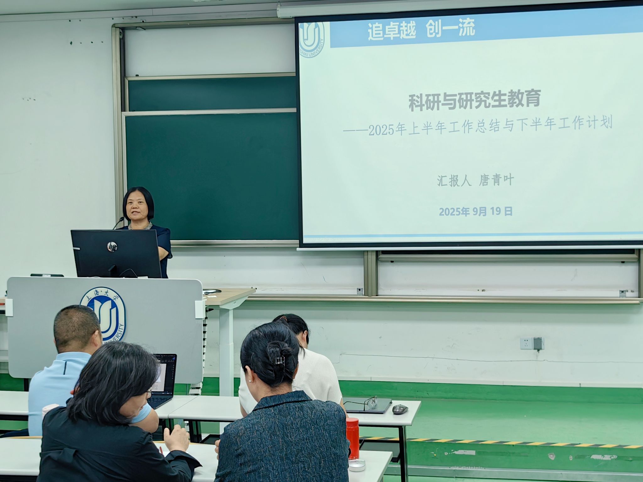 副院长唐青叶以 “科研提质、研培增效” 为目标,全面汇报科研与研究生教育工作。她系统梳理了 2025 年上半年学院科研工作的总体情况,对各类科研项目的申报和立项进行数据对比,分析了2025年国家社科基金项目语言学、外国文学、翻译、区域国别学和新闻传播学等学科立项特征,为教师申报科研项目提供方向指引。在研究生培养方面,唐青叶副院长介绍了 2025届研究生论文盲审的整体情况,2025年研究生生源质量与结构特点,以及新学制优化改革背景下研究生培养方案修订、AI课程设置的推进成效,并对下半年工作进行了科学规划。
