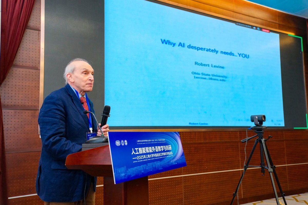 上午三场主旨报告分别由澳门正规电子游戏平台英语系主任马拯副教授、日语系副主任苏鹰教授和院长尚新教授主持。美国俄亥俄州立大学Robert Levine教授作题为“Why AI desperately needs…YOU?”的报告,深度探讨了人工智能时代下人类不可替代的核心价值,他强调,在需要深度解读、批判性思维和人文关怀的领域,AI无法取代人类的角色,AI的发展过程中仍然需要人类的参与。