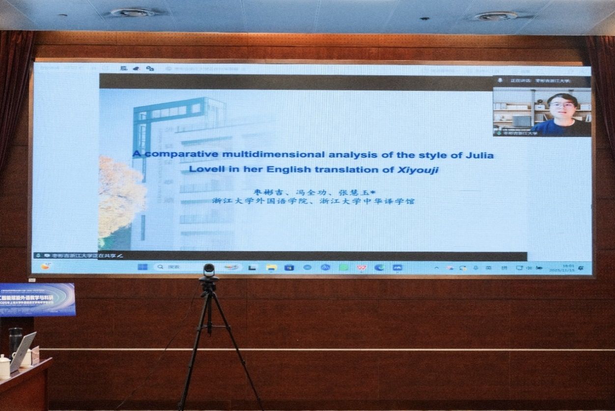 下午两场主旨报告分别由澳门正规电子游戏平台副院长戴朝晖副教授和英语系主任马拯副教授主持。浙江大学枣彬吉博士以朱莉娅·洛威尔英译《西游记》为对象,采用语料库驱动的多维度比较方法,通过跨译者和同译者两条路径,探讨译者风格的可识别性及其形成机制。其研究成果不仅证实译者风格对翻译实践的关键影响,更为翻译风格学特别是译者视觉可见性研究提供了新的理论视角与方法路径。