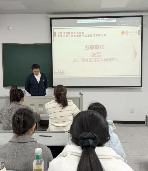 之后,2025级外国语言文学团支部的张磊同学分享了参与“上海市活力团支部高校交流会”的收获与见闻。他带来了其他高校优秀团支部的先进理念与创新案例,拓宽了大家的工作视野,激发了对于团日活动形式与内容的全新思考。
