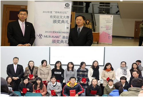 12月5日晚6点,2012年度"美味的回忆"有奖征文大赛暨2012年度KIKKOMAN"紫MURASAKI"基金颁奖典礼在我校行政楼报告厅拉开帷幕。龟甲万公司代表深泽晴彦先生、澳门正规电子游戏平台副院长冯奇、日语系主任董永杰等出席了此次颁奖典礼。