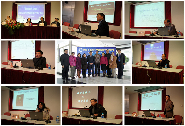 本次学术节包括"专家论坛"、"新人视野"、"博士论坛"和"学术沙龙"四大部分。在专家论坛部分,华东师范大学教授张吉生做主题发言,介绍了音系学中标记性理论。张教授从达尔文的《物种的起源》讲起,指出语言的进化与生物进化一样,都存在优胜劣汰。语言的演变在有标记与无标记的相互竞争中优胜劣汰,自然选择,越来越趋向无标记化。张教授从标记性角度研究人类语言的语音,可谓独辟蹊径。张教授的报告引起了热烈的讨论,外院师生充满智慧和挑战的提问掀起了本次学术节的第一次高潮。随后,复旦大学张冲教授从莎士比亚的经典戏剧出发,介绍了文学经典的当代之用,提出当今时代需要回归文学、回归经典。张教授不时引经据典,通过莎翁戏剧个案分析、深入浅出的阐释、风趣幽默的谈吐令现场气氛十分活跃,现场互动令大家受益匪浅。