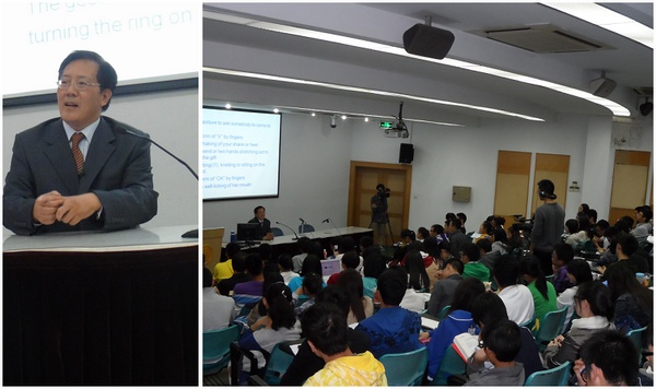 庞教授从非言语交际中的文化误解、言语交际中的文化误解和本意良好的文化误解等方面讲述了文化误解的表现形式、形成原因和消解文化误解的主要策略。他认为学生掌握了英语的基本语言运用能力后更要注意对文化误解现象的认知和对异族文化习俗的了解。他还指出,只有意识到文化误解和文化冲突的显性和隐性存在,才能更好地消除文化误解,促进跨文化交流和谐和友好地进行。在谈及非言语交际时,庞教授特别强调了在体态语、副语言、客体语和环境语方面出现的文化误解。他通过大量的事例来说明和论证文化误解对跨文化交际的影响和妨碍,其英文通俗易懂,案例剖析引人入胜。