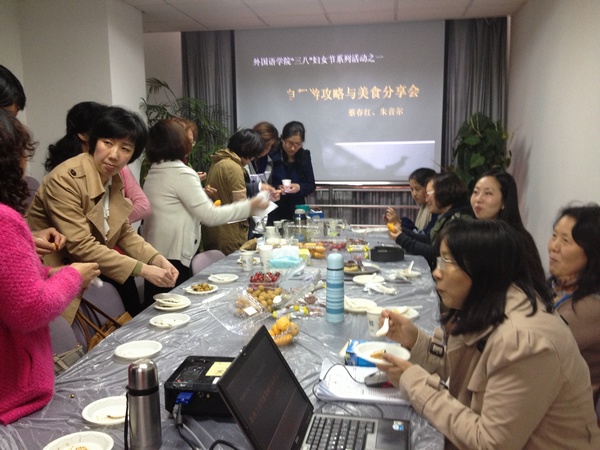虽然今年的三八妇女节在寒假中悄悄过去了,但是庆祝活动永远不嫌晚。为庆祝我们自己的节日,给姐妹们提供一个放松身心、分享经验、增进感情的机会,在学院工会和妇委会的组织下,在学院党委书记和院长的关心下,2015年4月20日下午,外语学院的教师姐妹们在C302汇聚一堂,举办了"自助游攻略及美食分享"系列活动之一,让大家享受了一场味觉和视觉的饕餮盛宴。