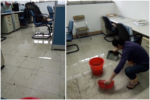 另外,由于12月9日夜间上海突遇罕见的冬季大雨,澳门正规电子游戏平台所在的C楼教学楼屋顶因下水口被堵,淤积的雨水渗漏到了四楼各办公室内。所以当10日一早上班在运送完上千袋旧试卷后,院办的黄澄老师和王新中老师就拎起水桶、拖把和畚箕来到C楼四楼教师办公室进行清理,完全靠手工作业畚箕抄水的方式将办公室地面约有五、六十桶的积水全部清空,最后用拖把拖干净地面。期间得到了李津老师的大力协助,还提供了可甩干式拖把吸水拖地,大大提高了工作效率。