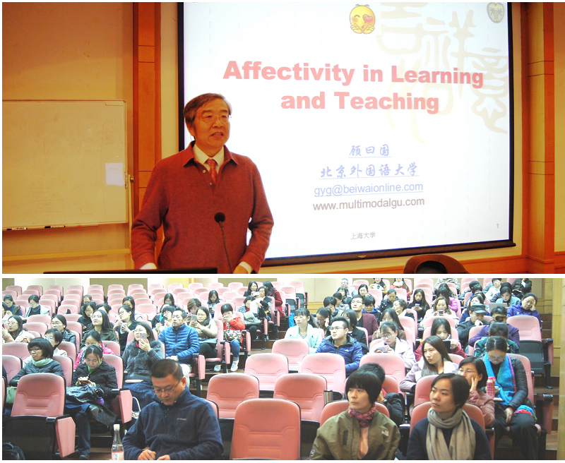 顾教授从"生命、生存与情感"、"情感类型"、"情感与学习的研究假设"、"教师与教师职业情感"、"教师职业情感研究框架"、"课堂当下情感与教学效果"、"情感管控与自我修炼"等七个方面探讨了情感对学生学习和教师教学方面的影响和作用。顾教授提出情感是生存的必要条件、情感是一切学习的基础;他将人类情感分成背景情感、基本情感和社会情感等三类;进而提出了情感与学习的研究假设,并通过大量的实验验证了该研究假设;随后,顾教授认为,教师是一种特殊职业,教师在教学过程中需要对职业情感进行管控,积极培育正面情感、及时控制负面情感,并从个人经验中提出了教师修身养性的建议。最后,顾教授用美国著名教育家Marva Collins的名言"Don't fix students, fix yourselves"作为讲座的结束。